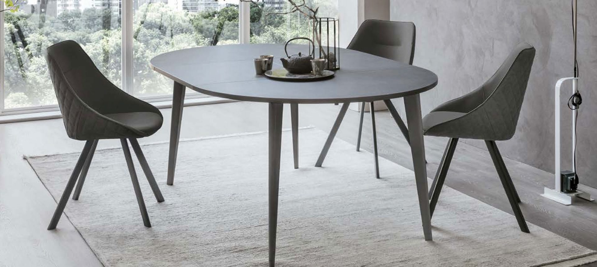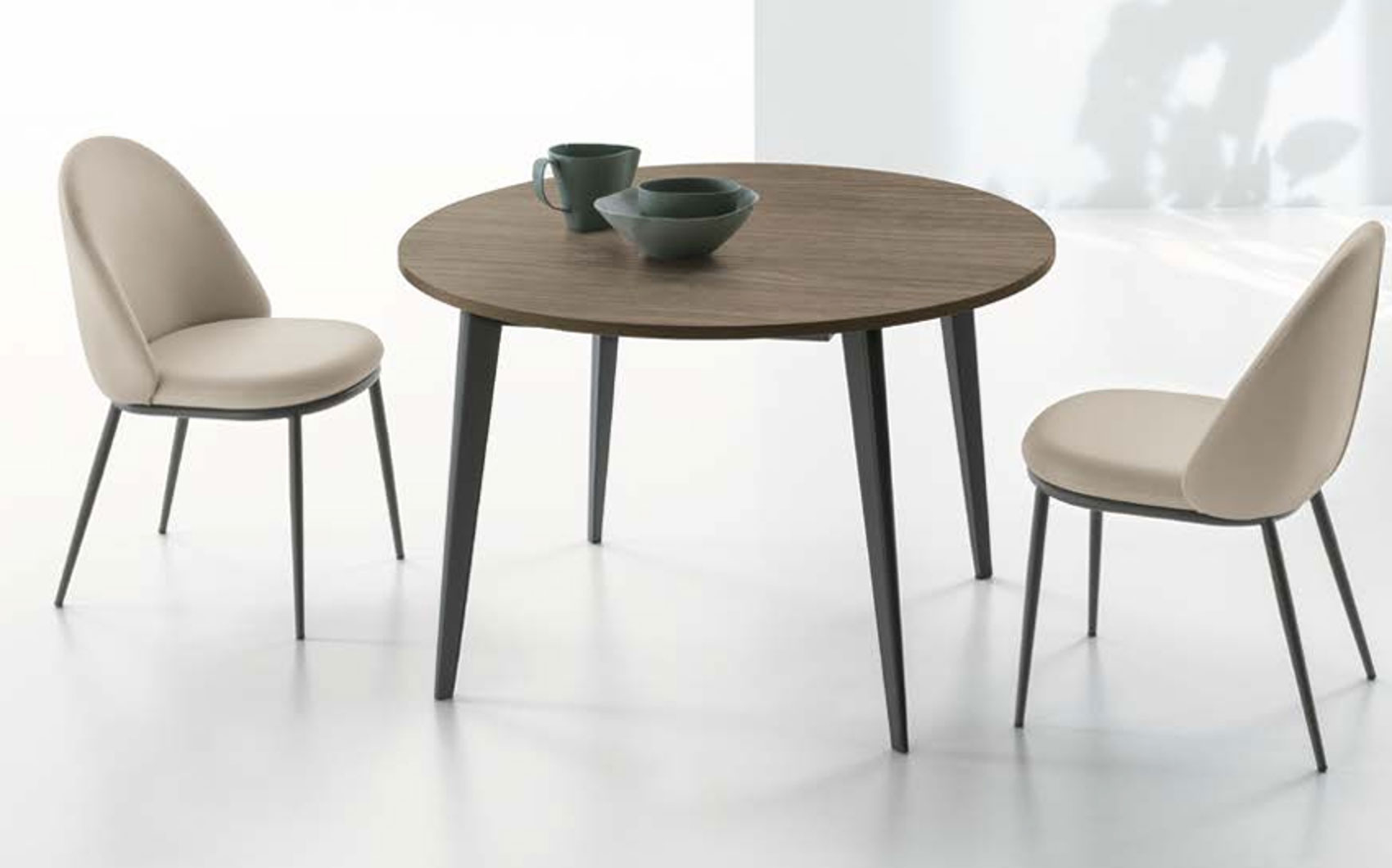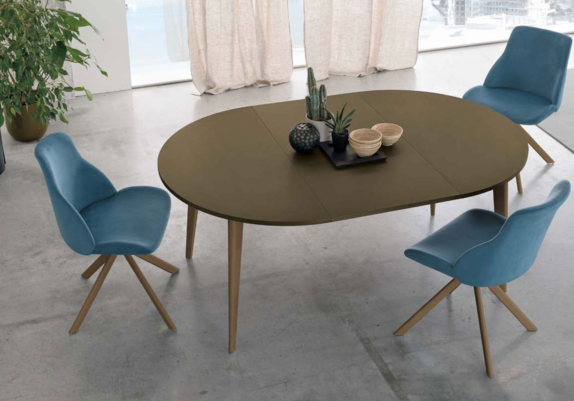 Tavolo allungabile con basamento in metallo verniciato. Piano rotondo che si trasforma in ovale in laminato.