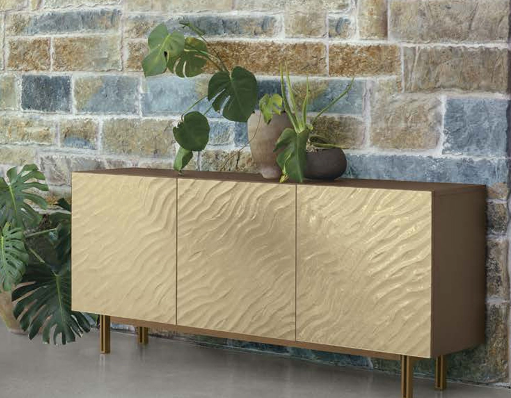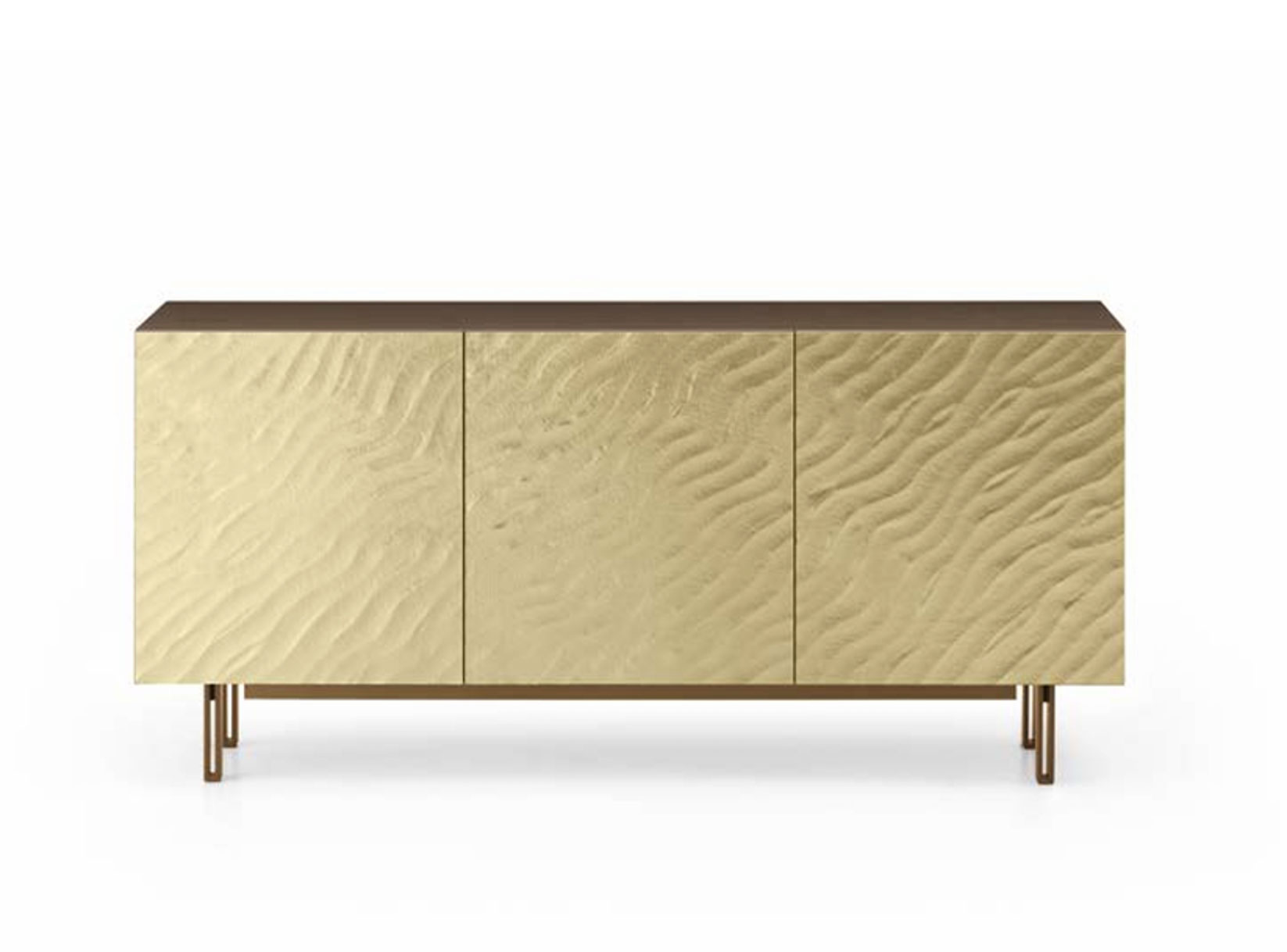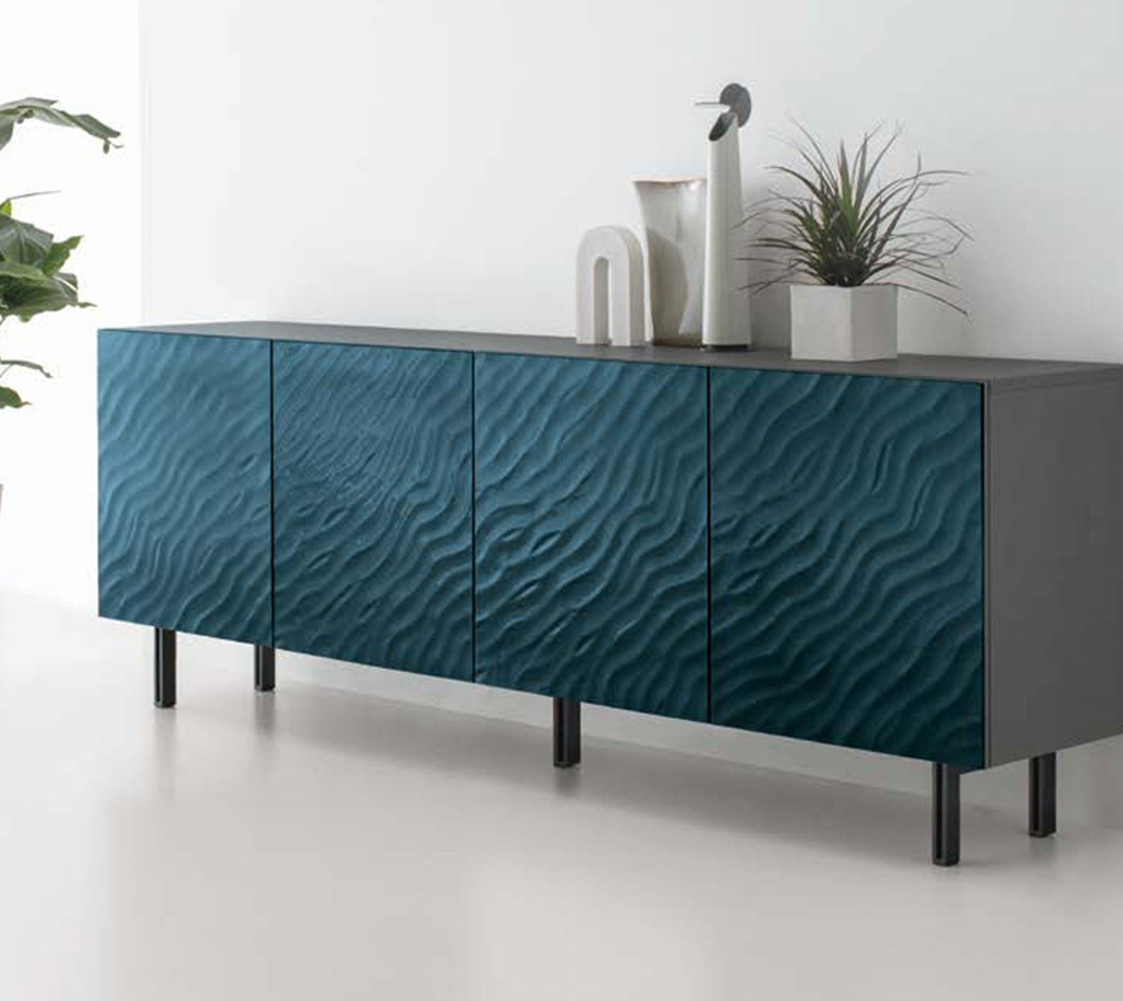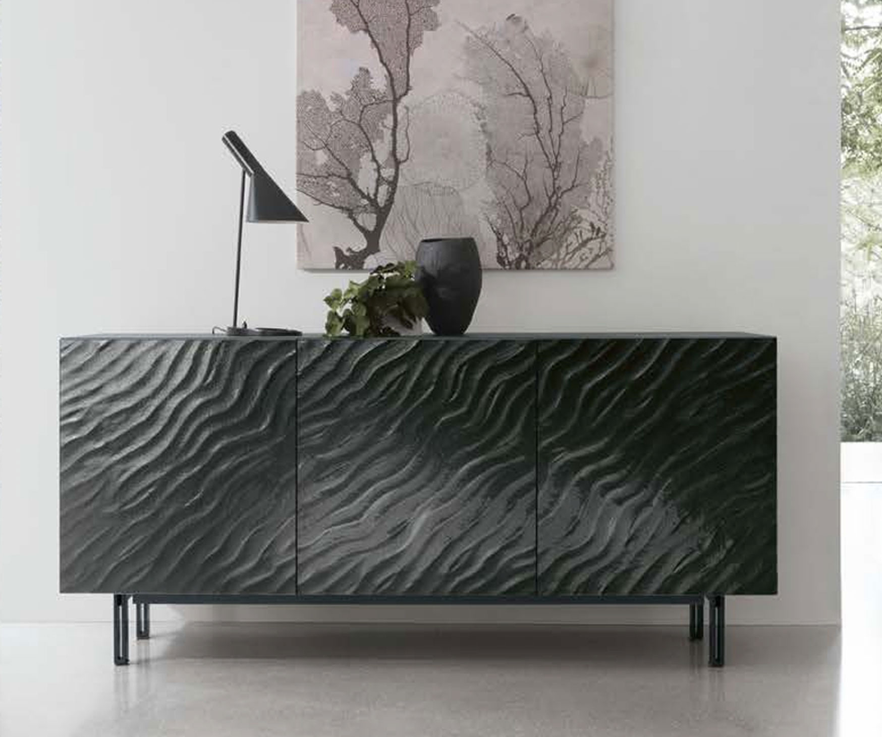 Madia con ante con corpo realizzato in laminato. Ante in laminato con frontale in vetro ondulato effetto dune.