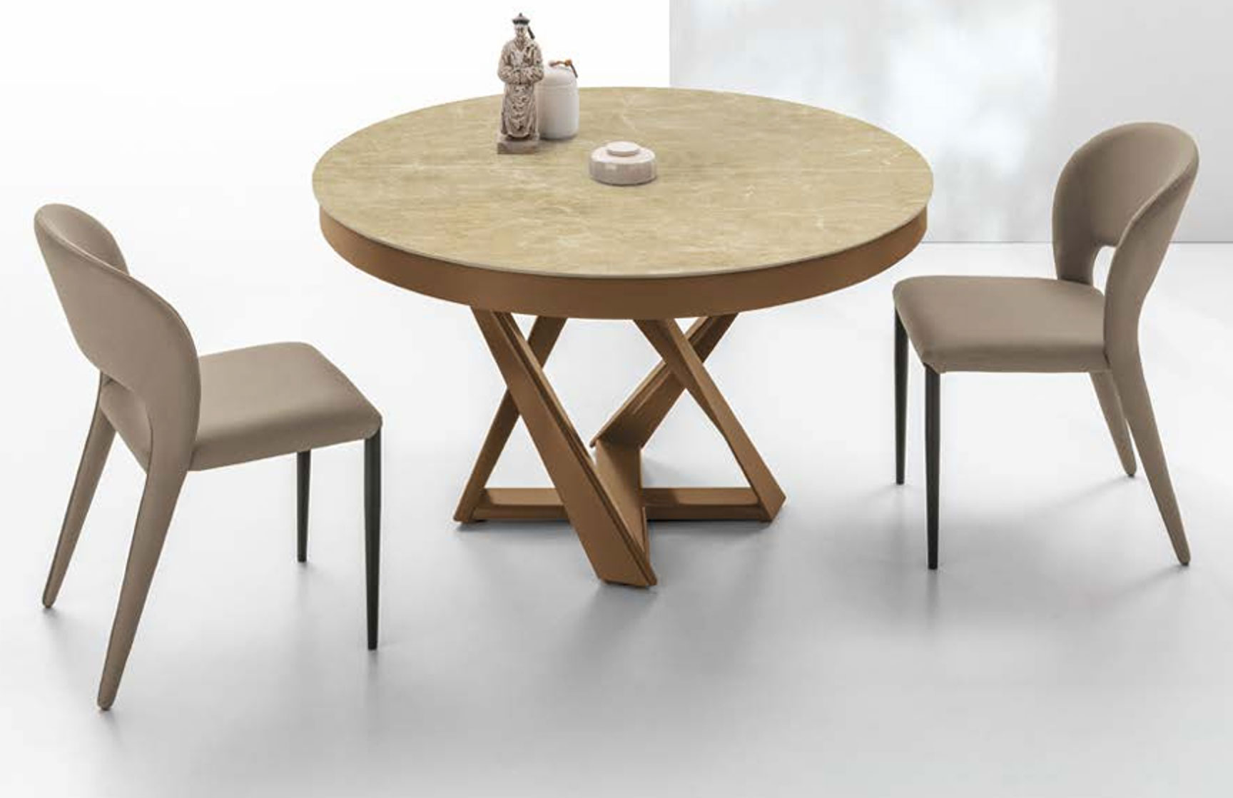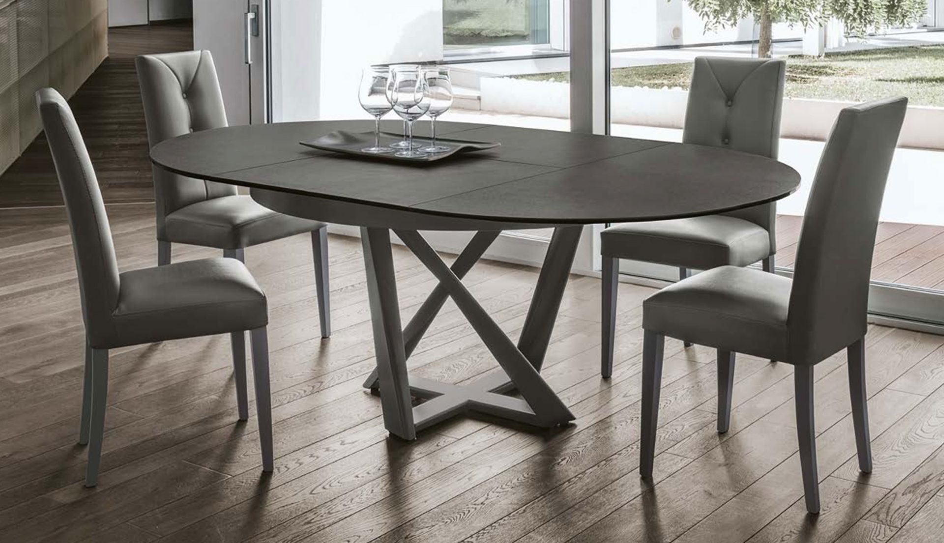 Tavolo allungabile con basamento centrale in metallo verniciato. Piano rotondo che diventa ovale in gres porcellanato.