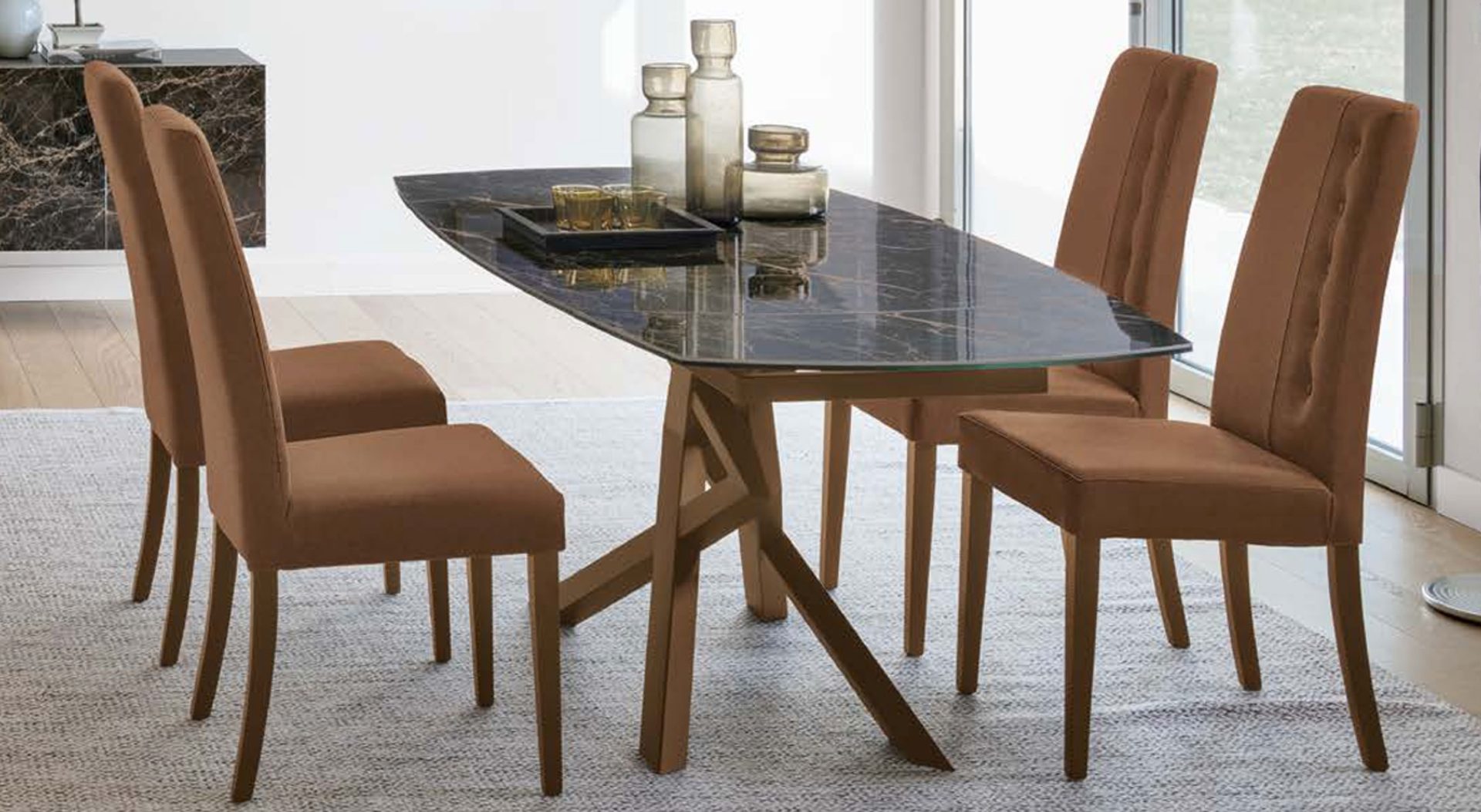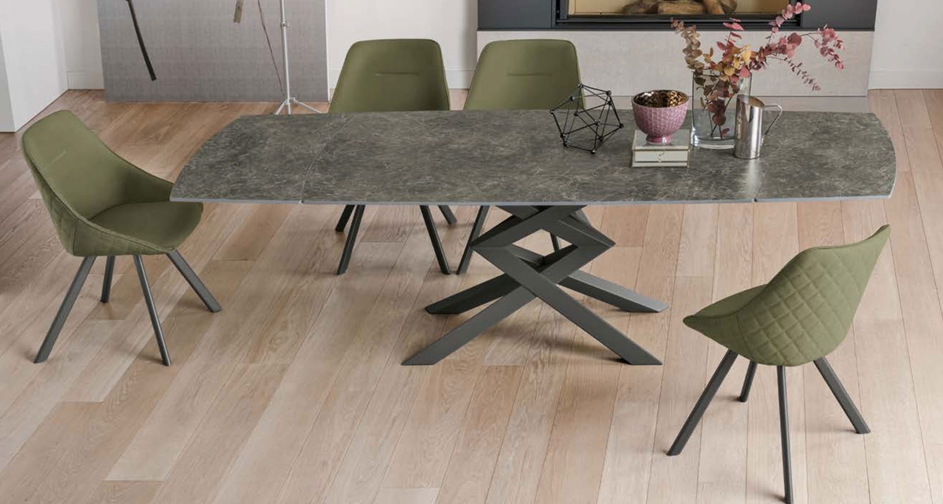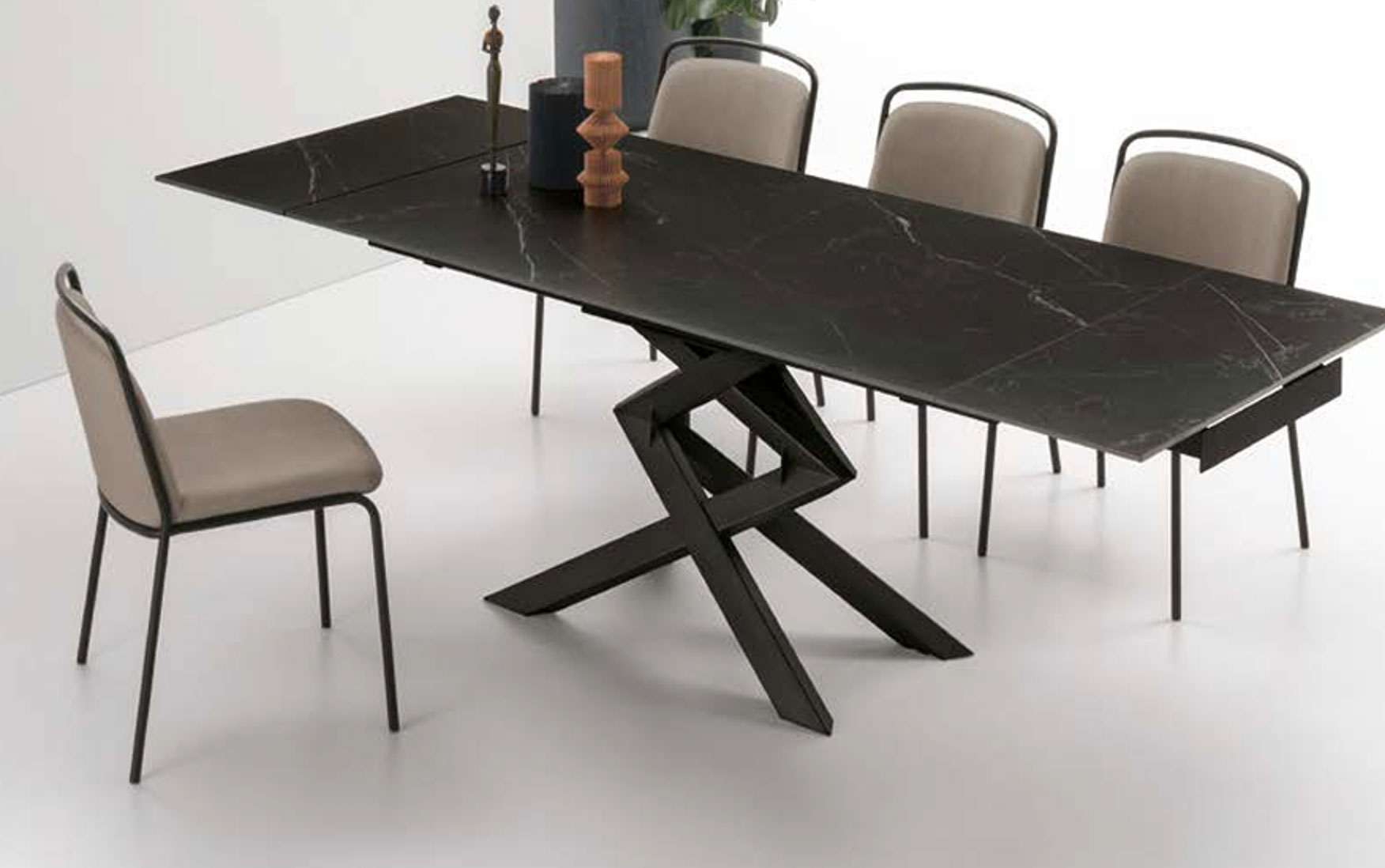 Tavolo allungabile con basamento in metallo verniciato. Piano girevole in gres porcellanato.
