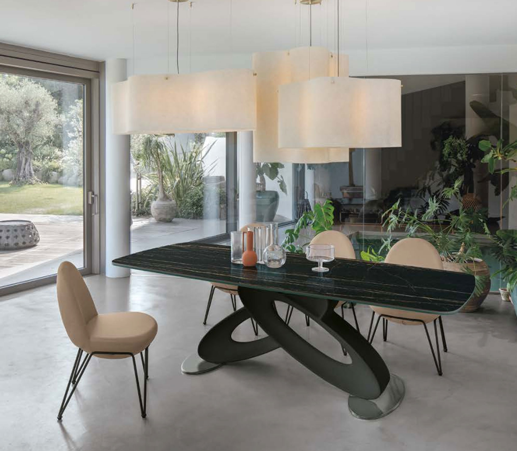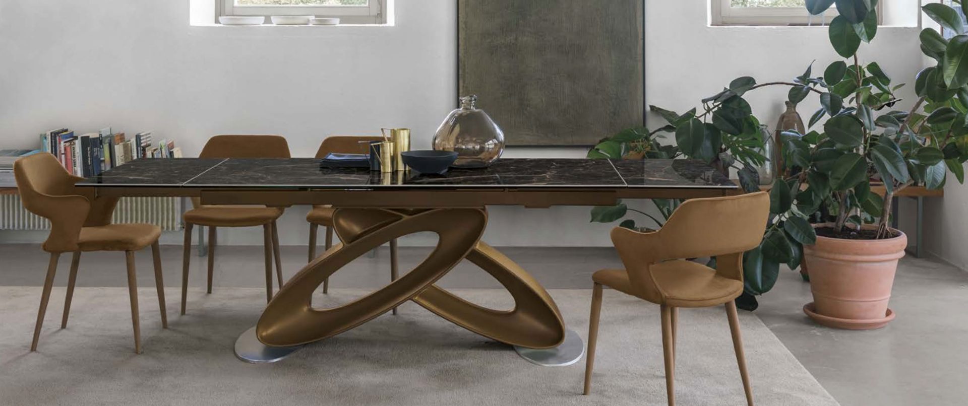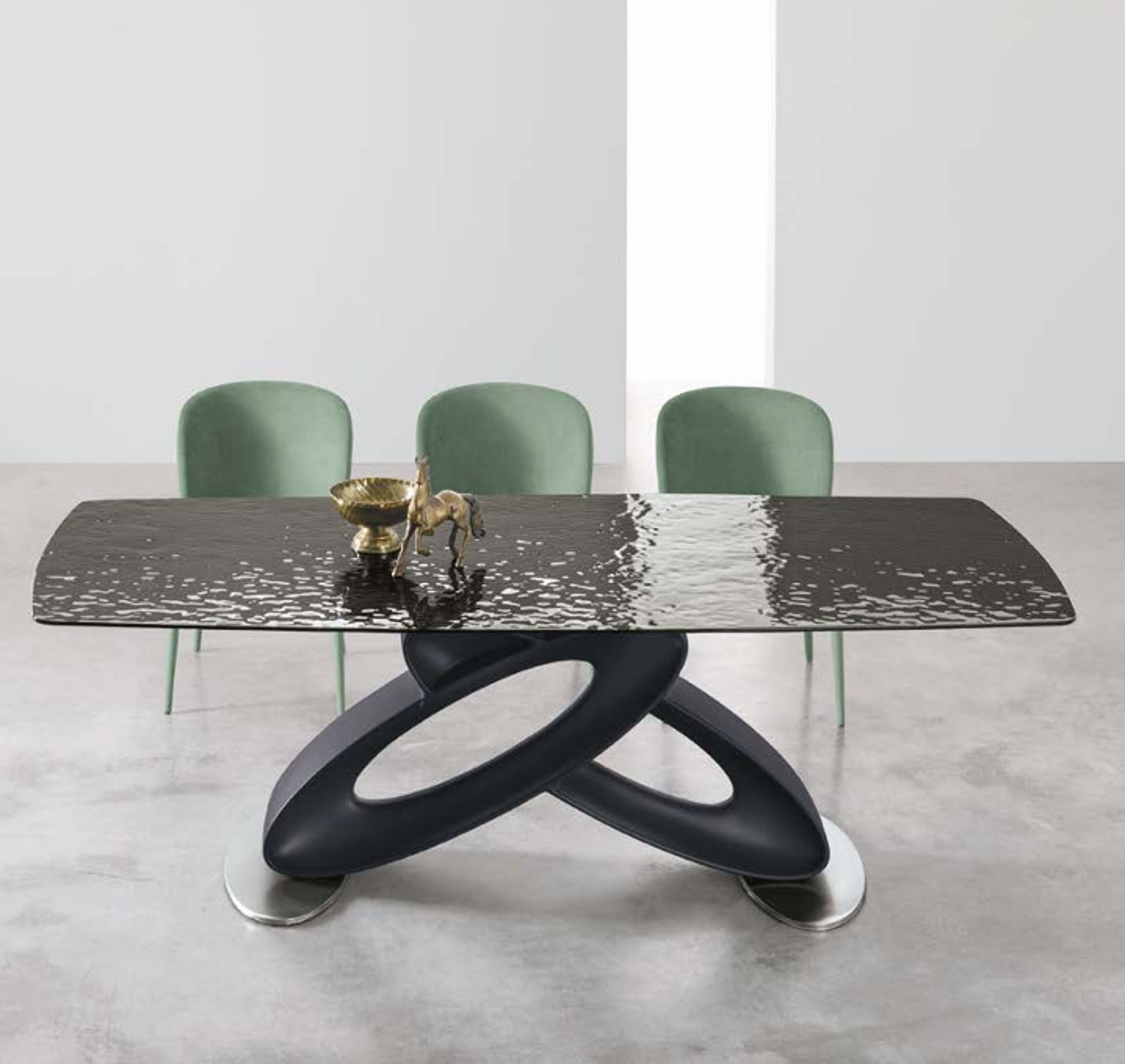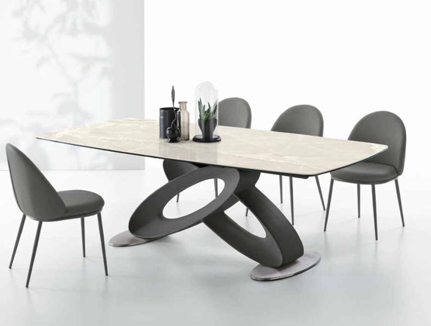 Tavolo allungabile con basamento in poliuretano. Piano in gres porcellanato, vetro temperato con stampa digitale, vetro ondulato, impiallacciato legno.