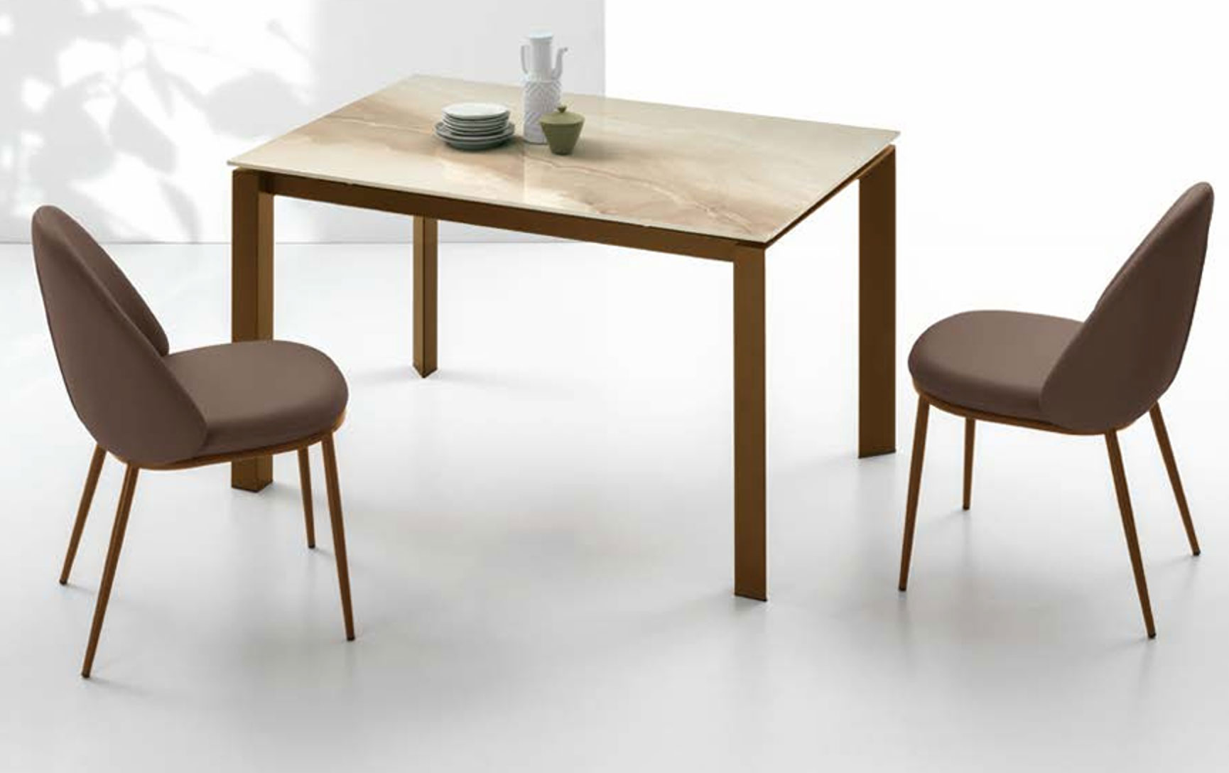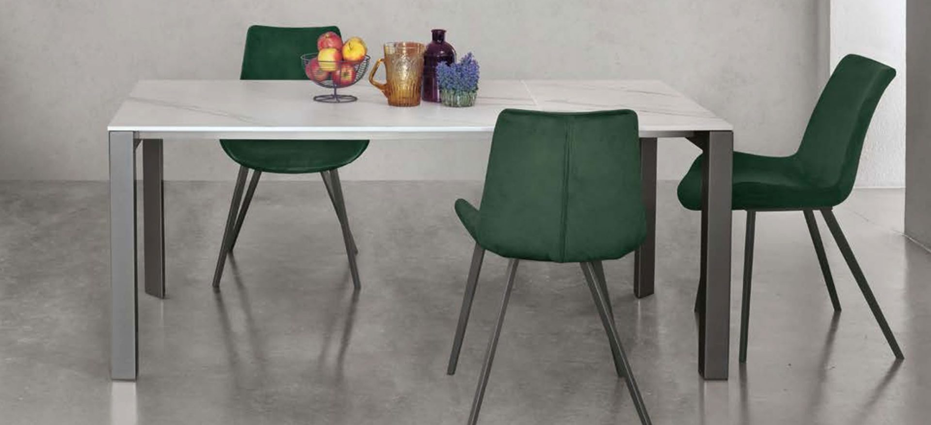 Tavolo allungabile con basamento in metallo verniciato. Piano in gres porcellanato.