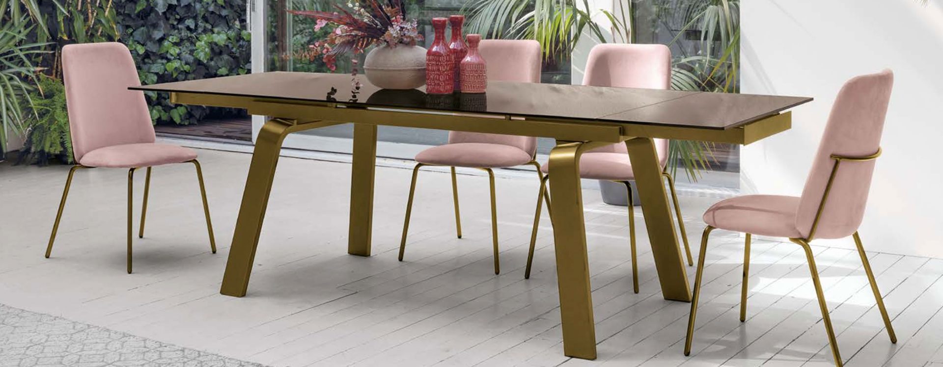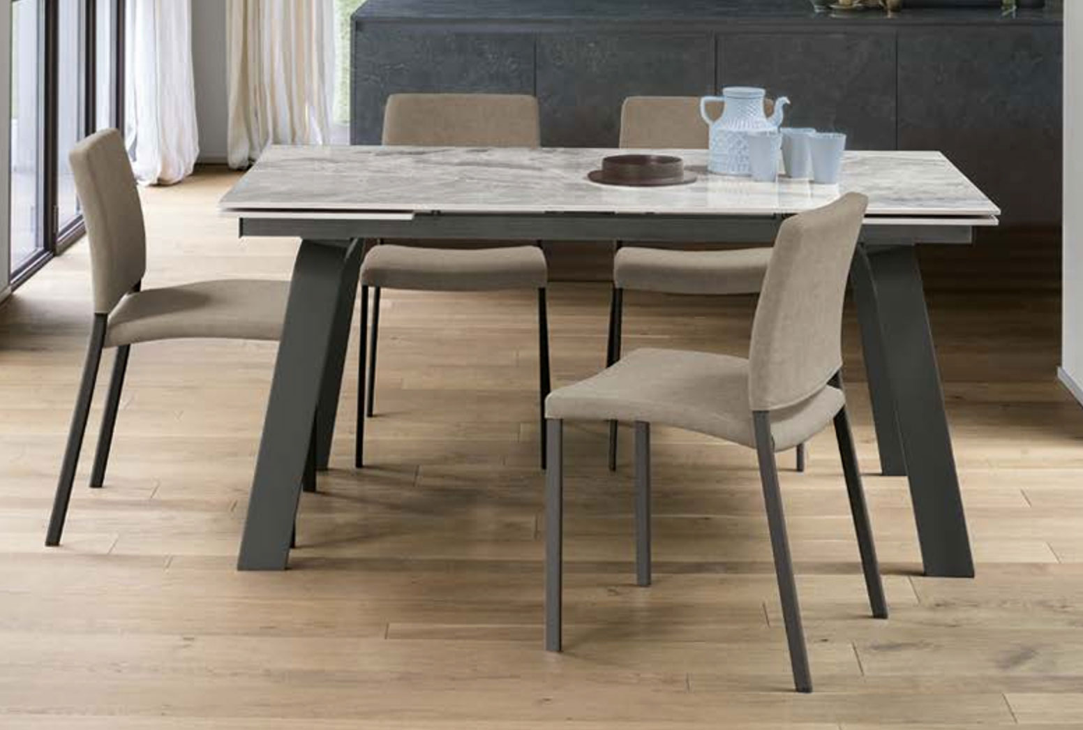 Tavolo allungabile in metallo verniciato.. Piano ed allunghe laterali in Gres Porcellanato o vetro.