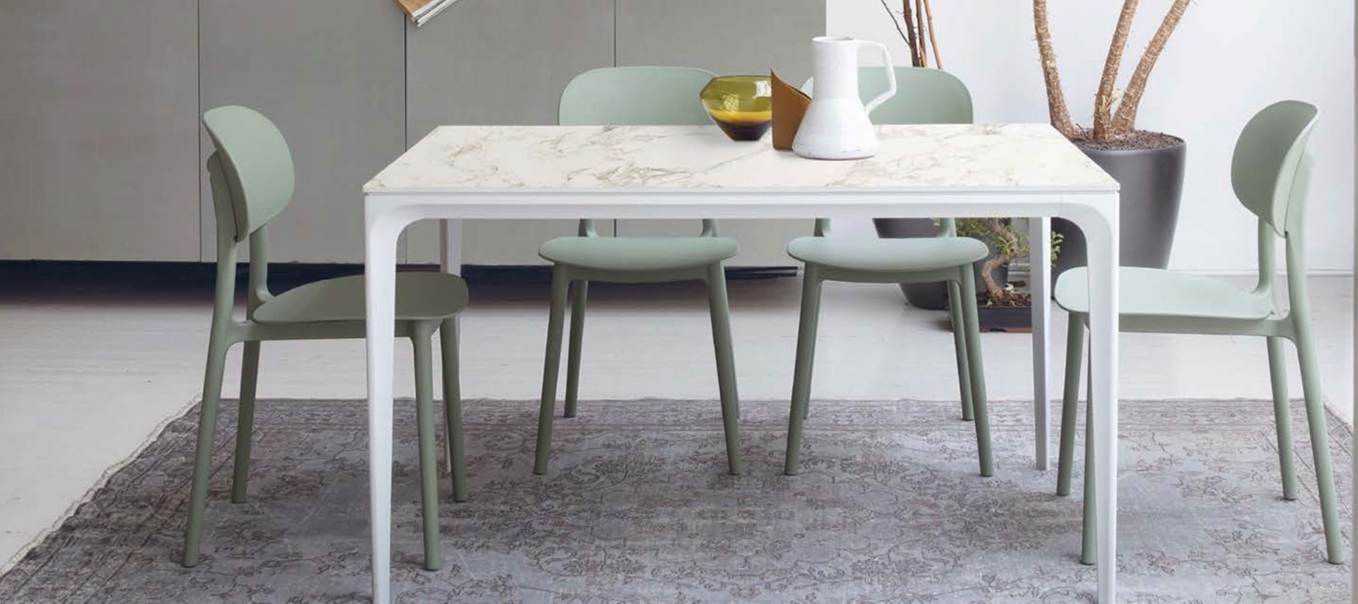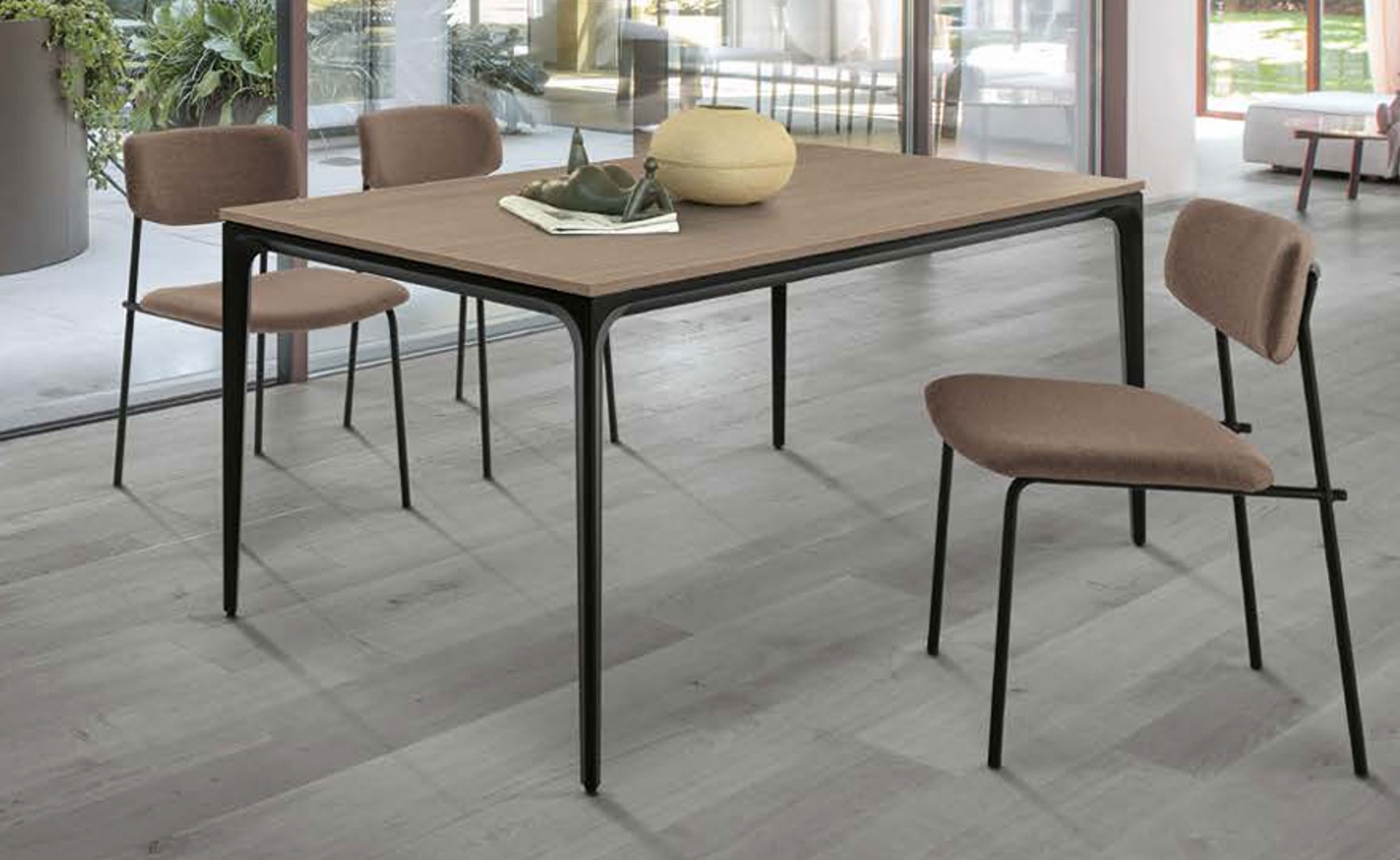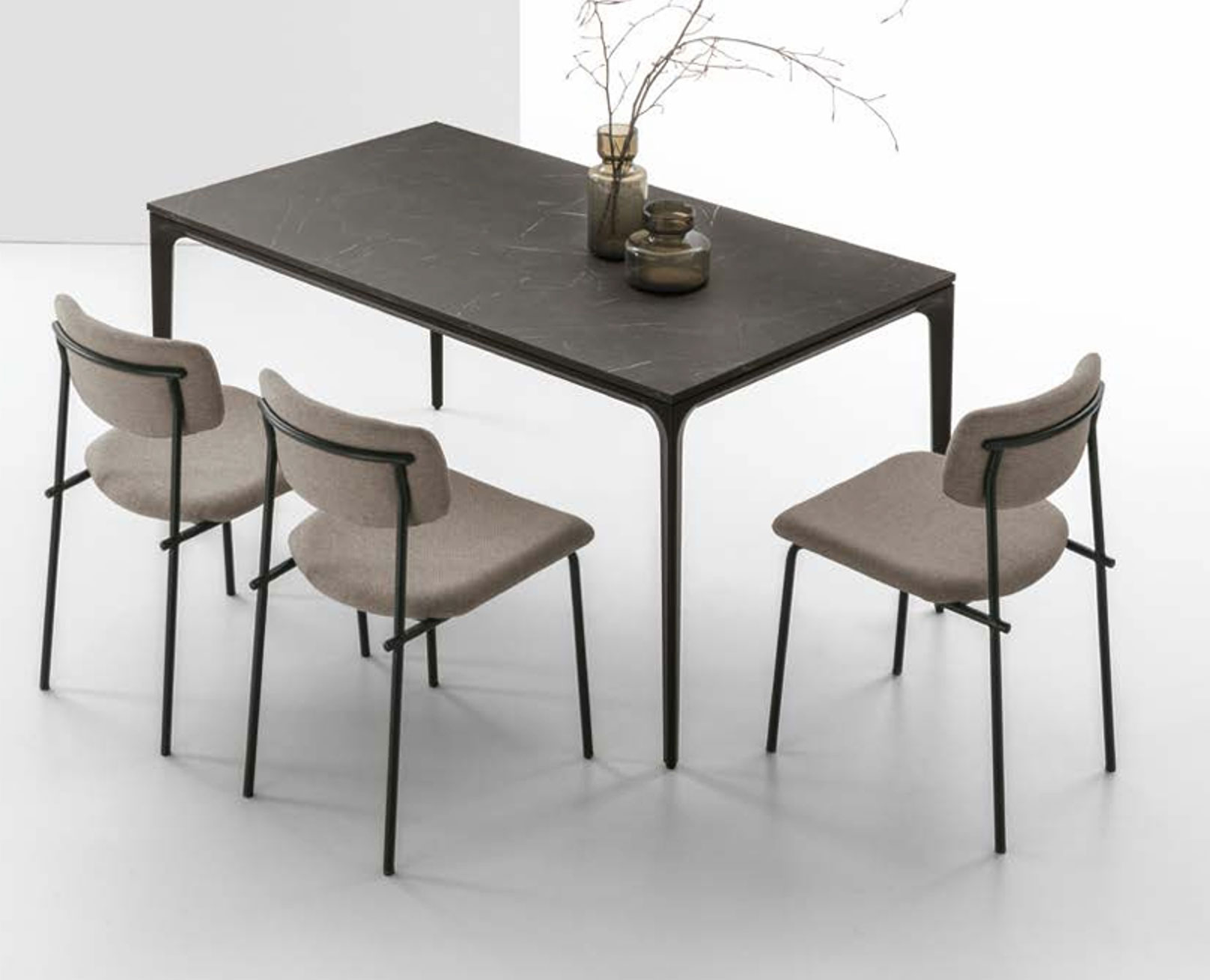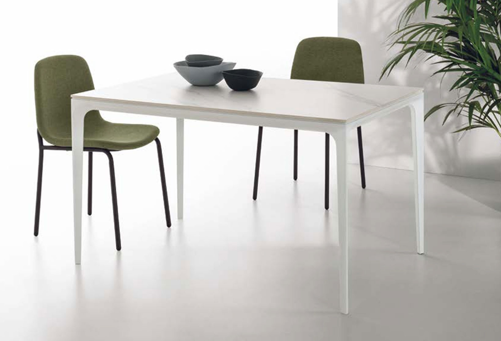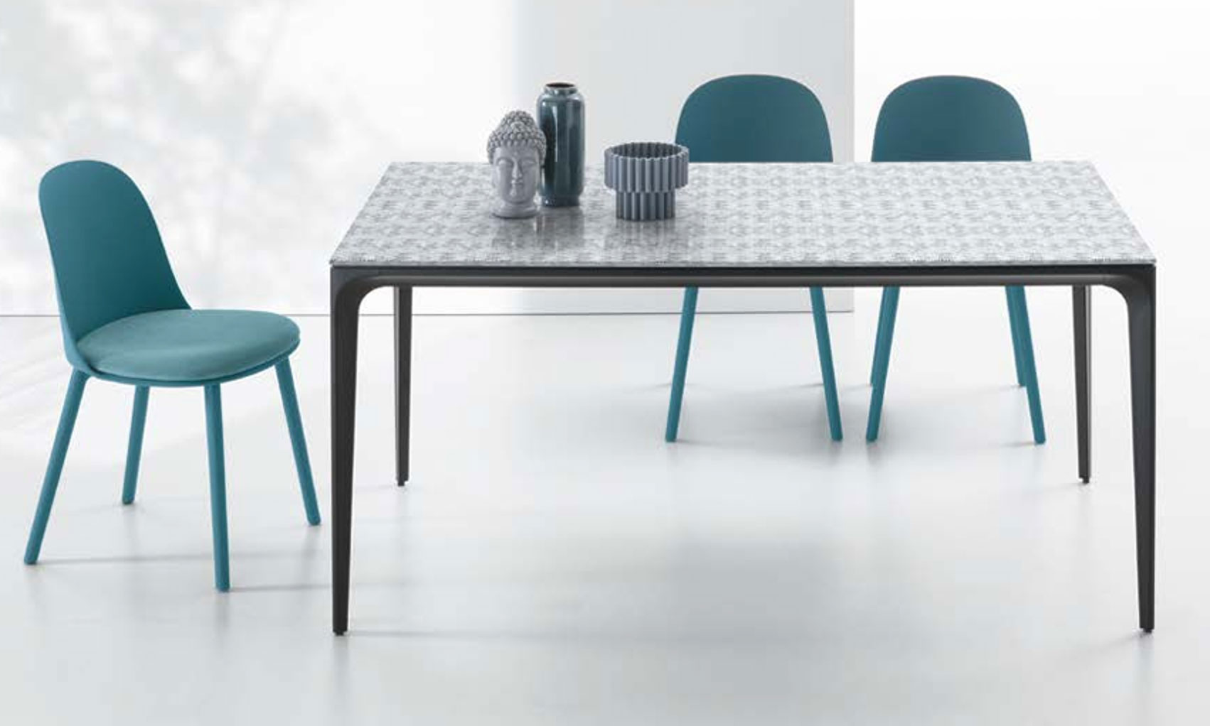 Tavolo fisso con struttura in alluminio verniciato. Piano in gres porcellanato, laminato o vetro temperato con stampa digitale.