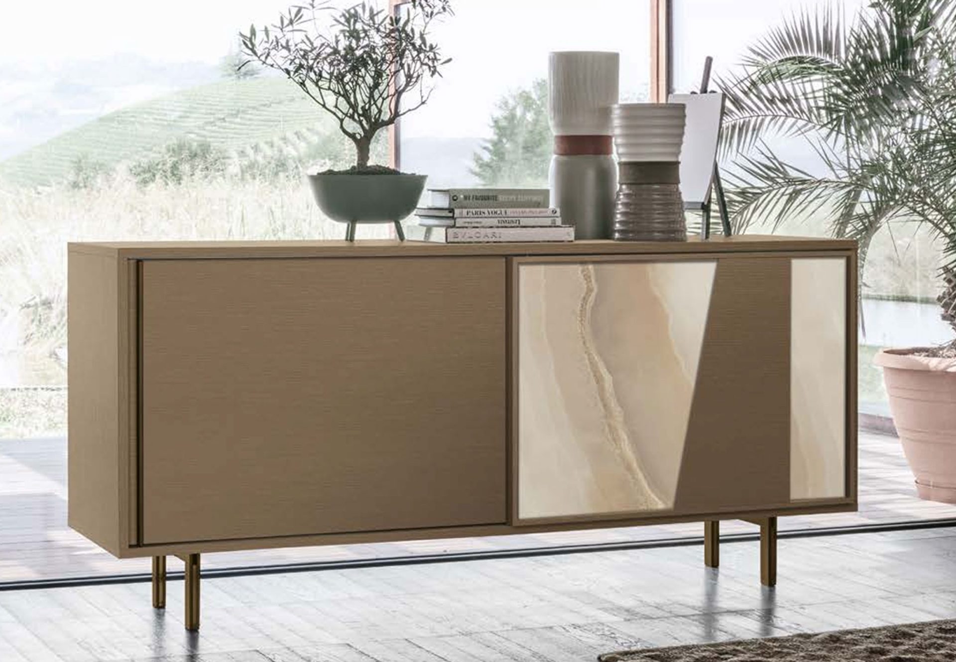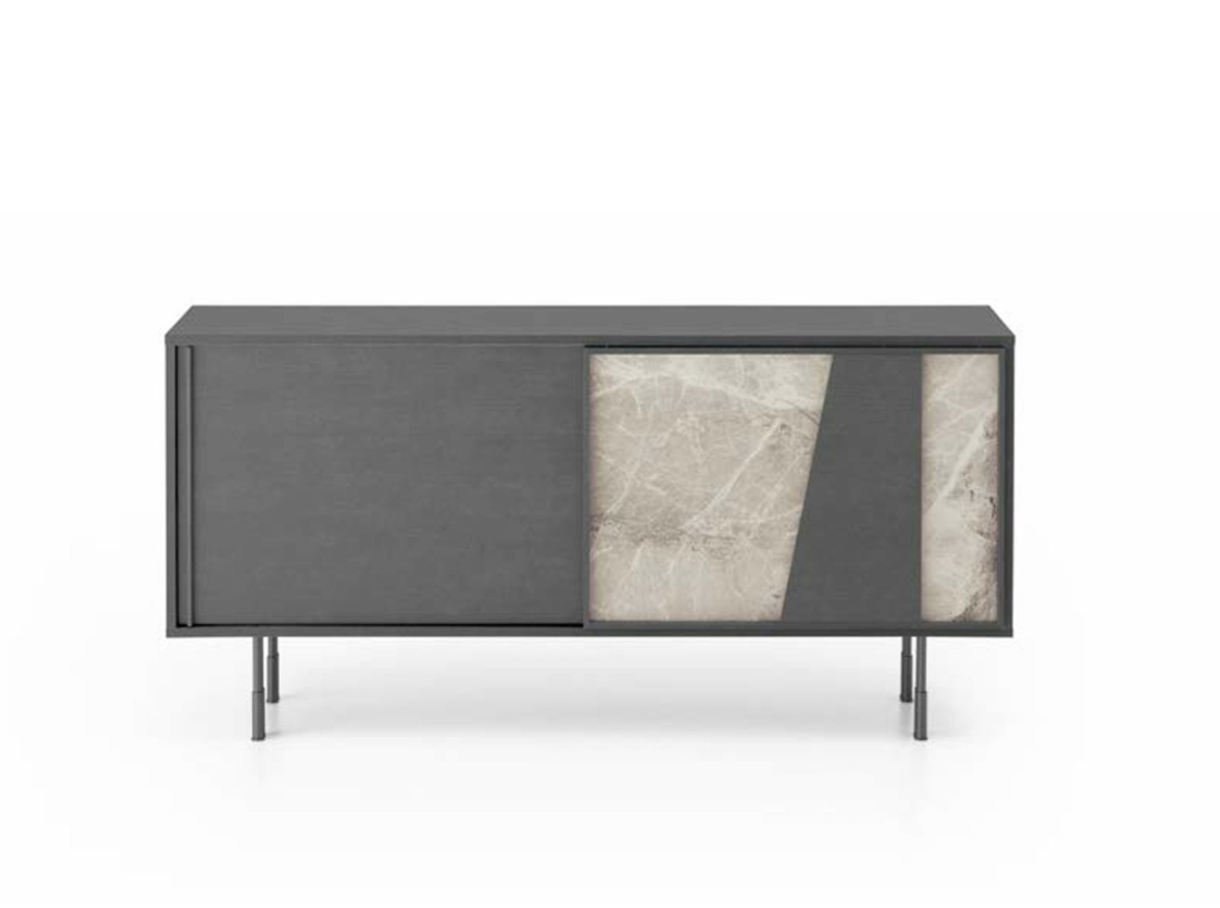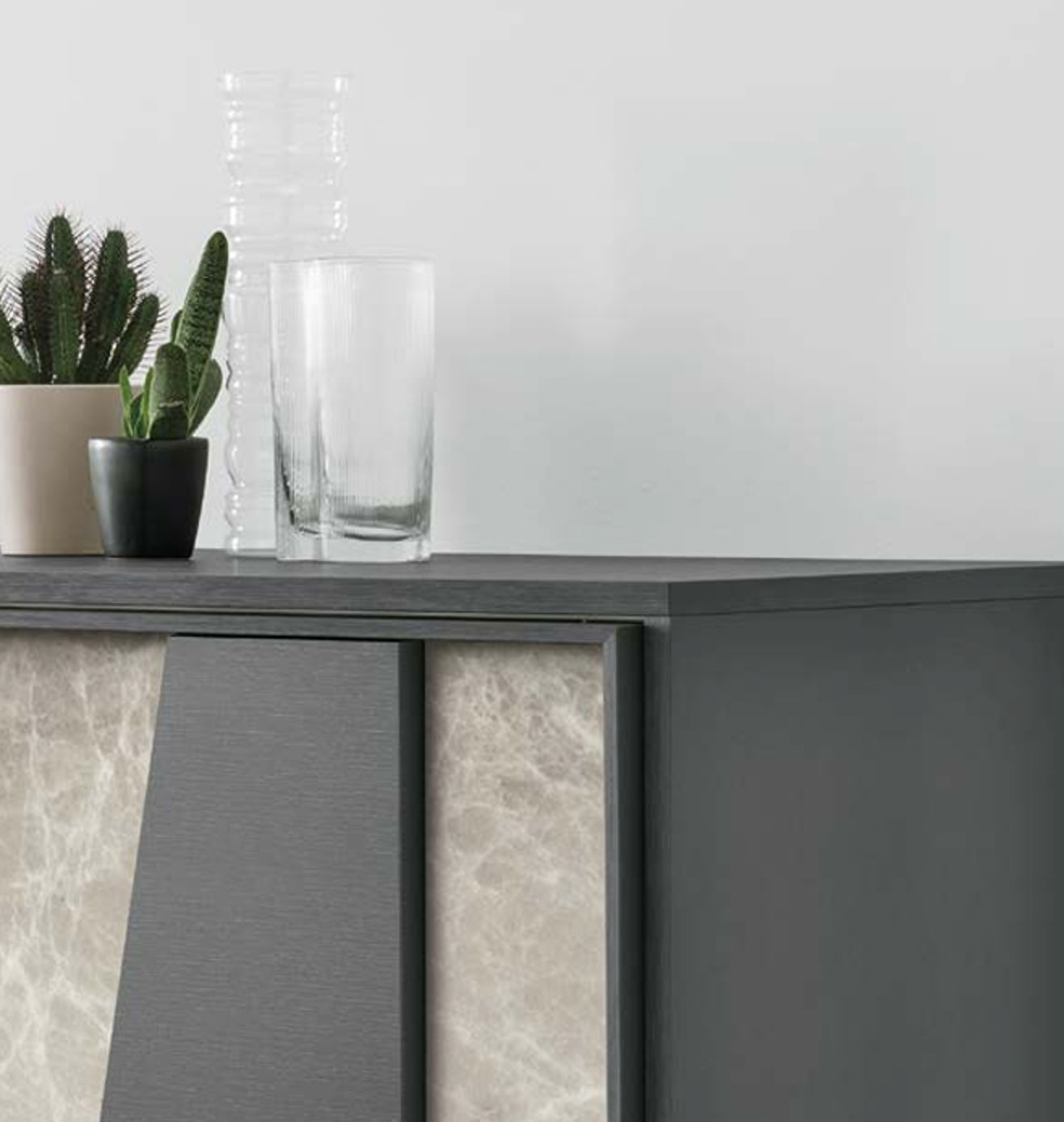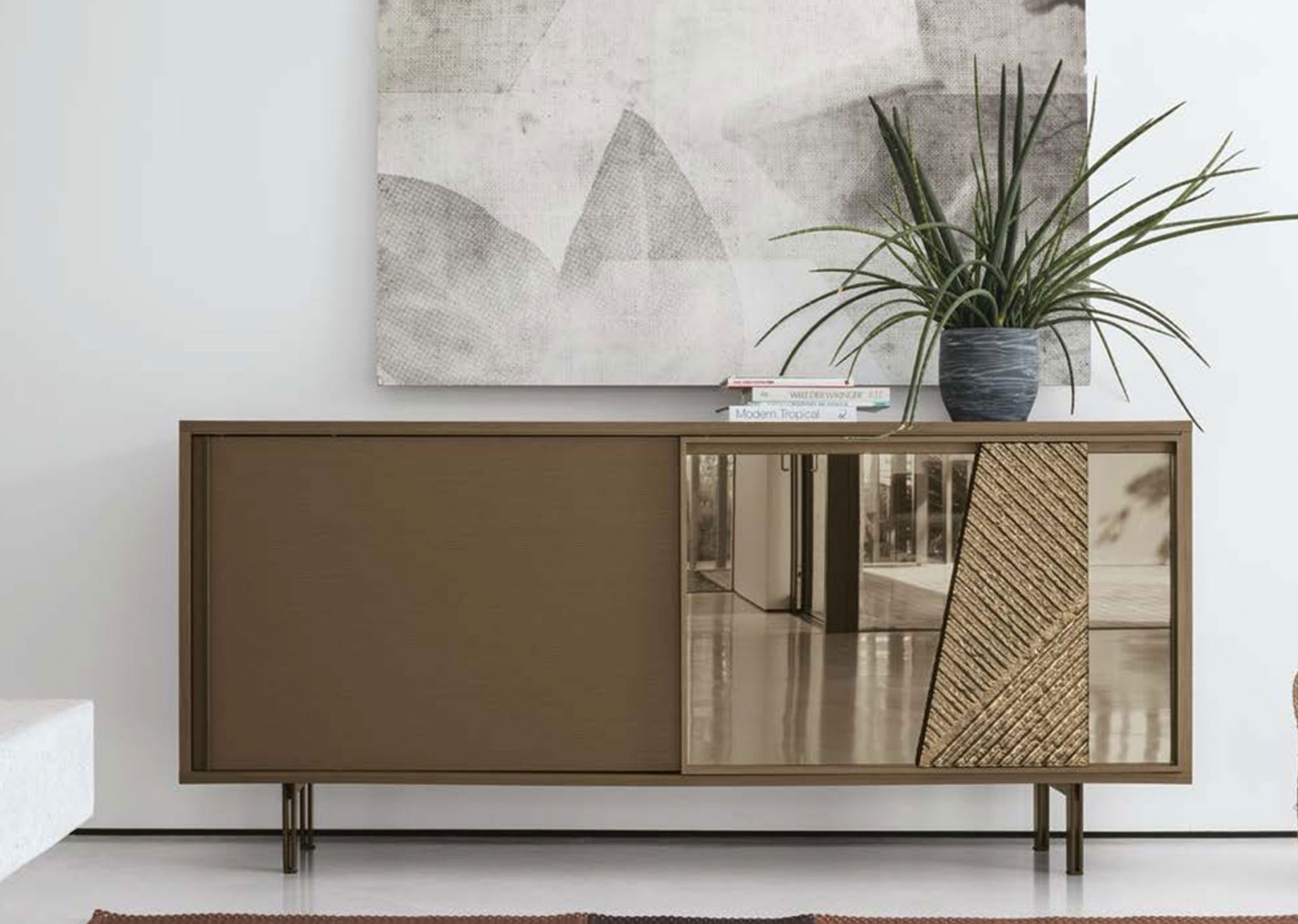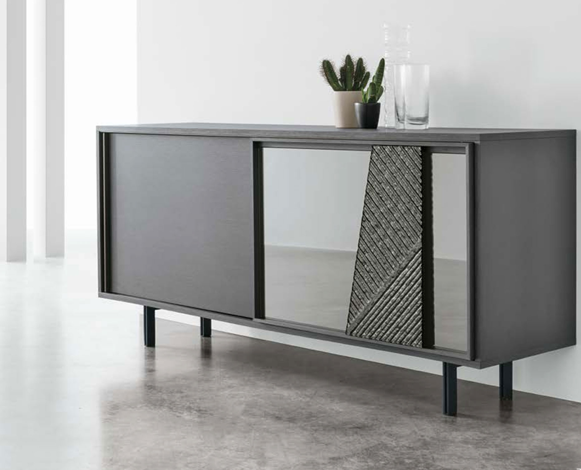 Madia a due ante scorrevoli realizzata in laminato spazzolato con maniglia in vetro ondulato. Inserto specchio opzionale nell’anta di destra.
