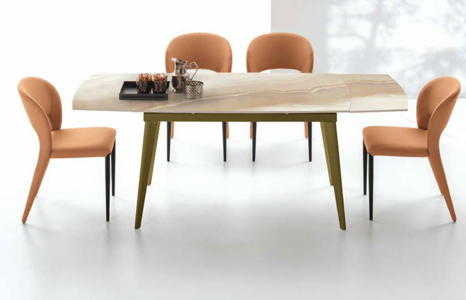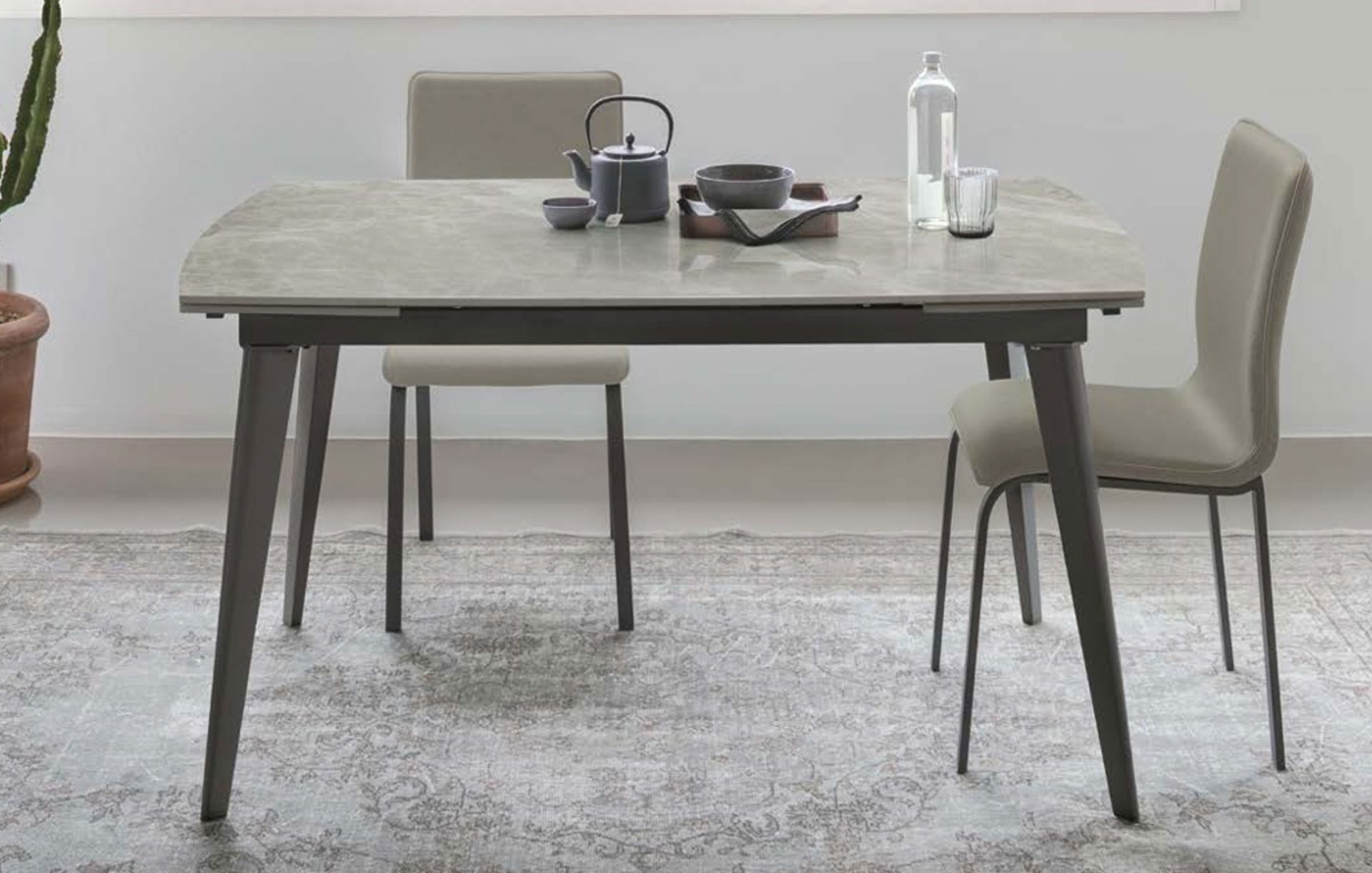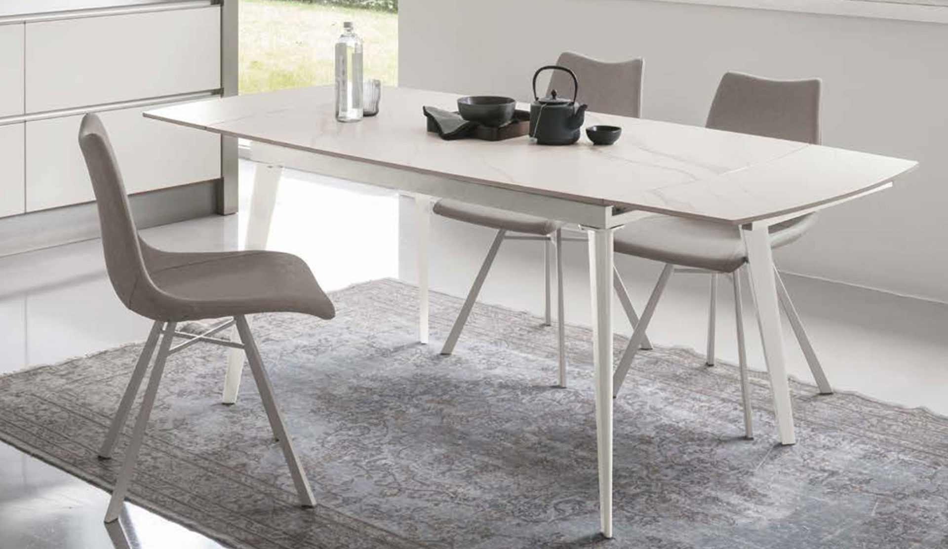 Tavolo allungabile con basamento in metallo verniciato. Piano a botticella in gres porcellanato.