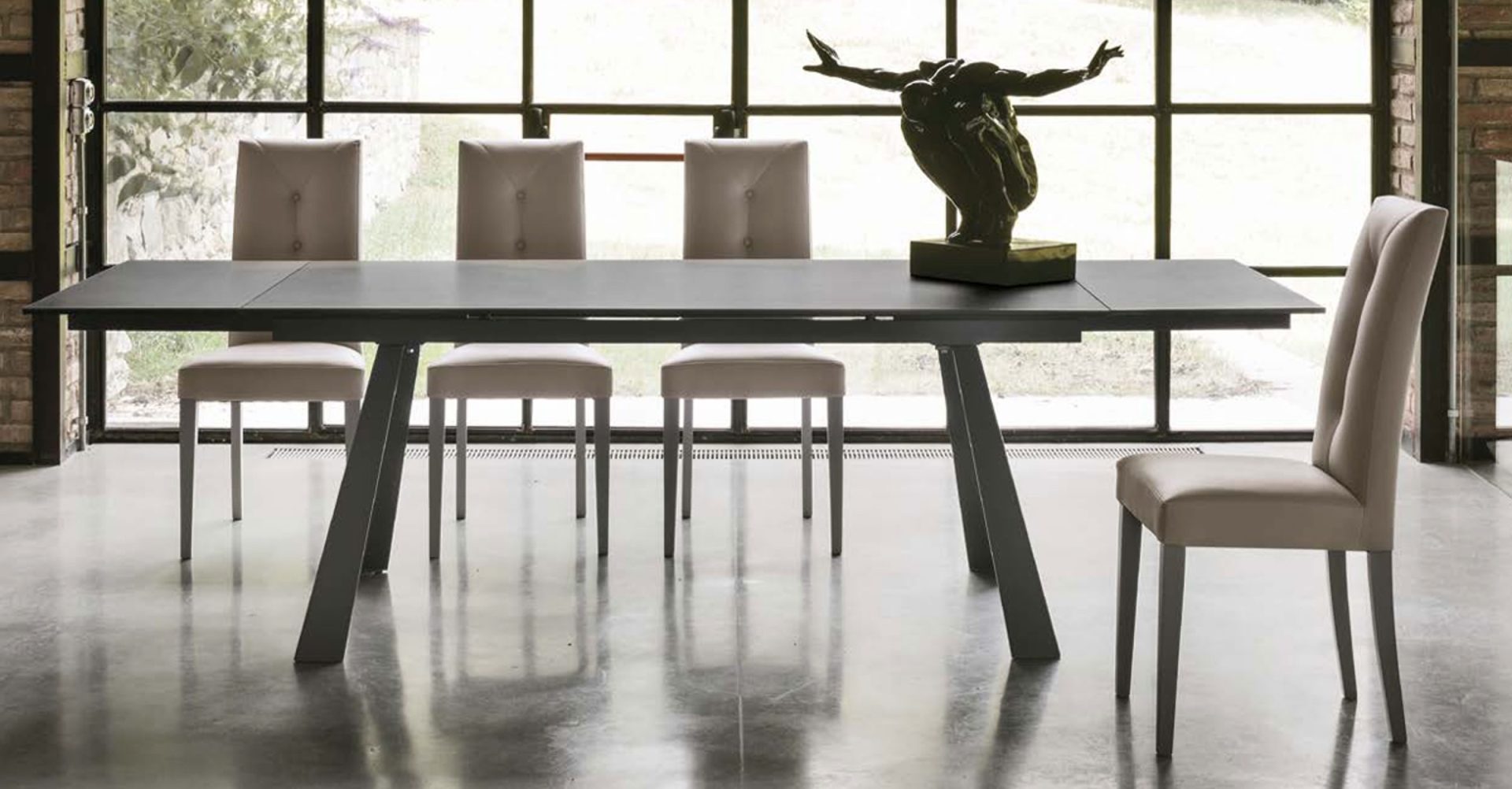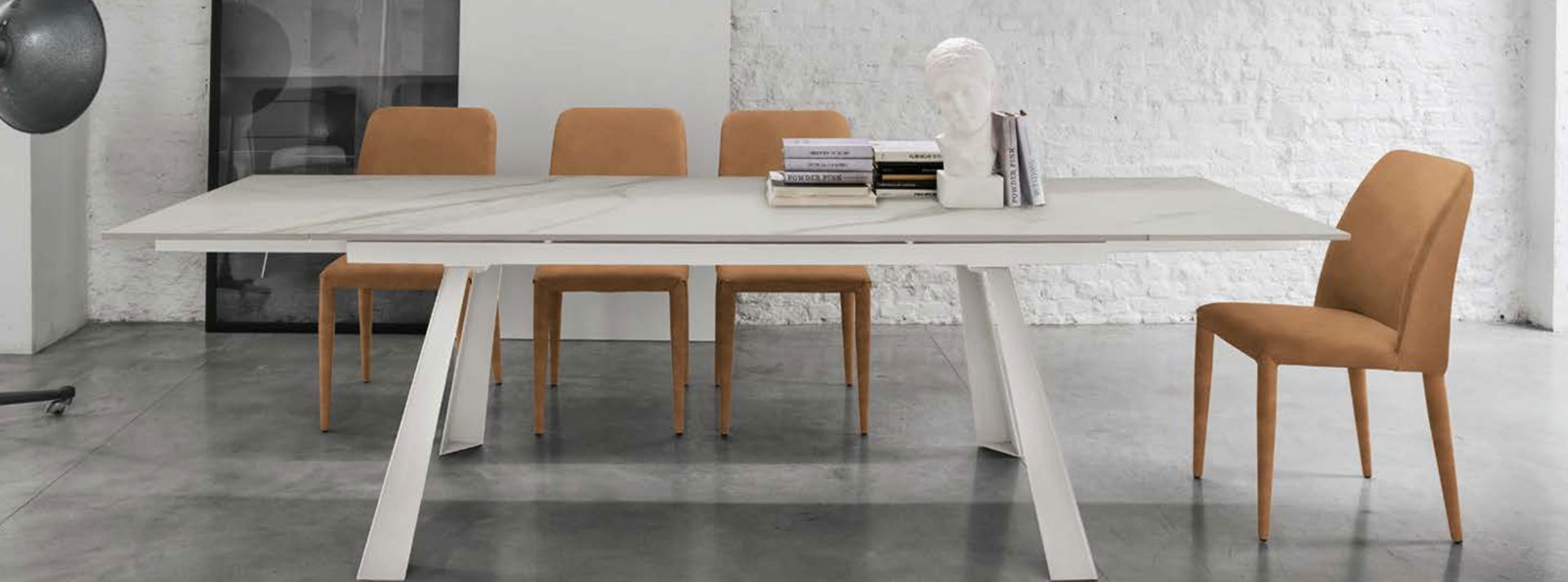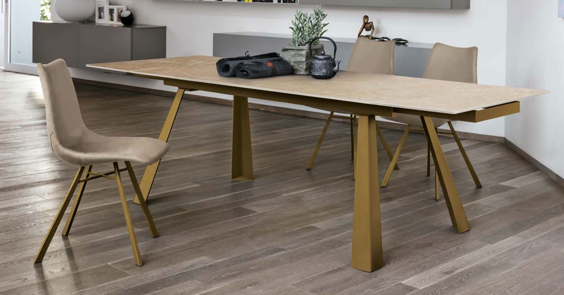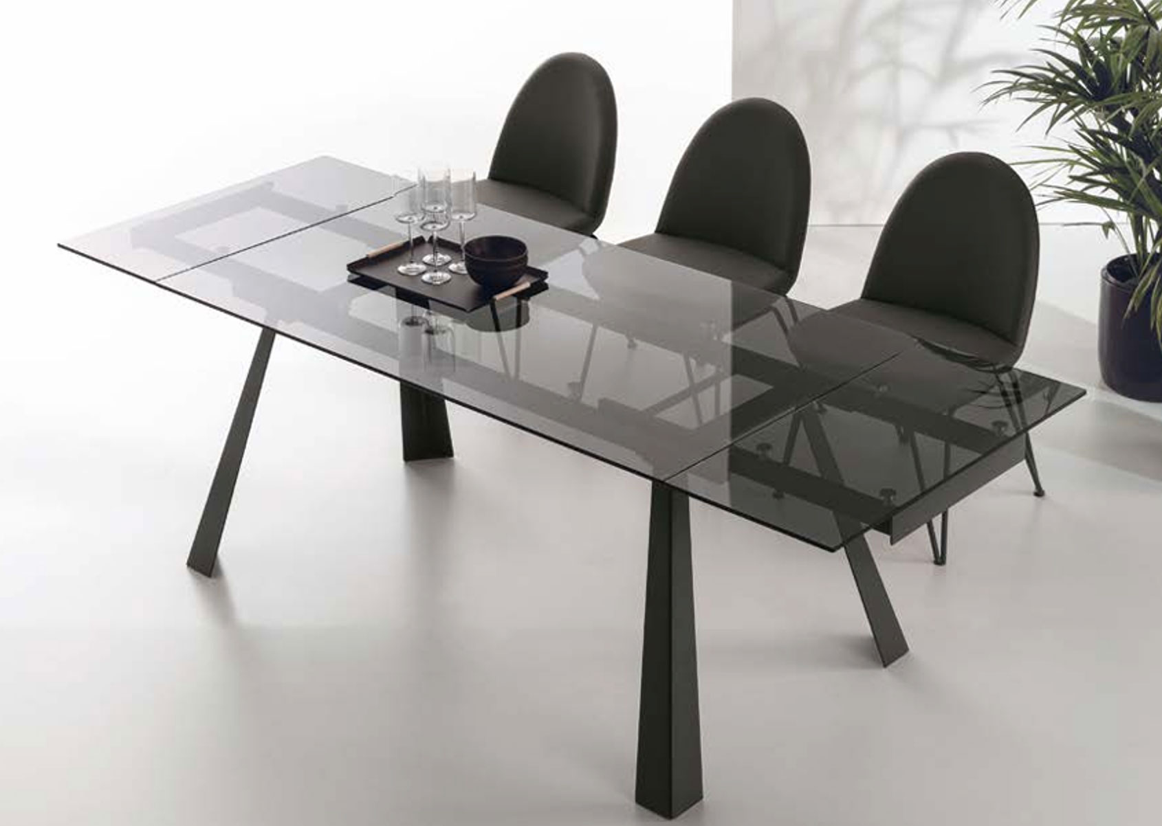 Tavolo allungabile con struttura in metallo verniciato. Piano ed allunghe in Gres porcellanato o Vetro.