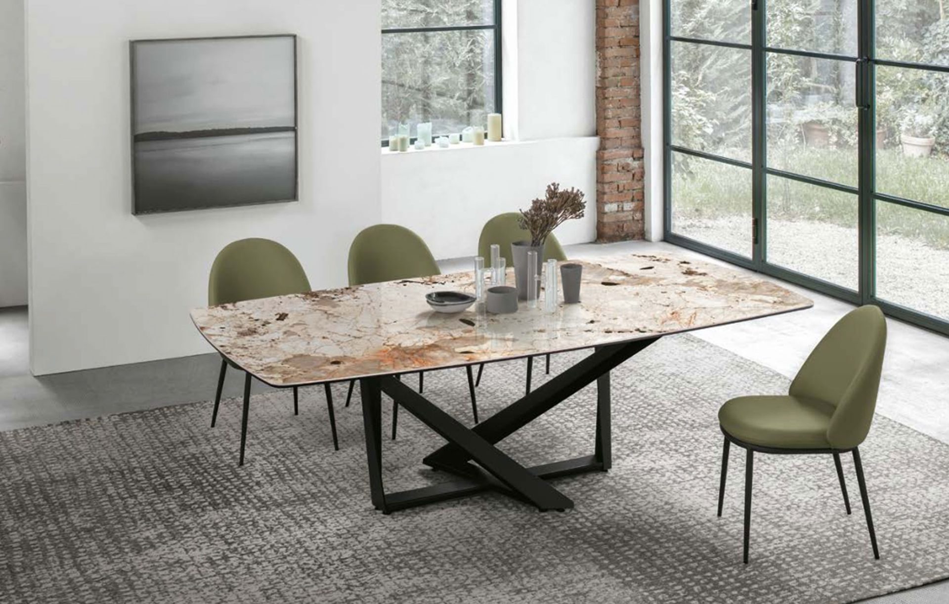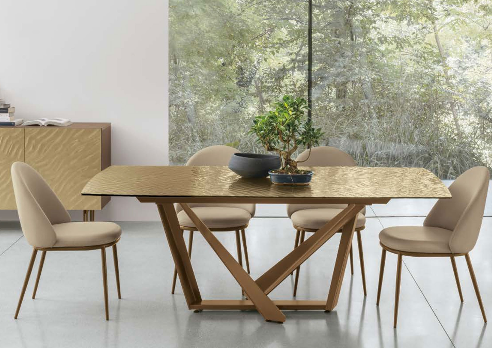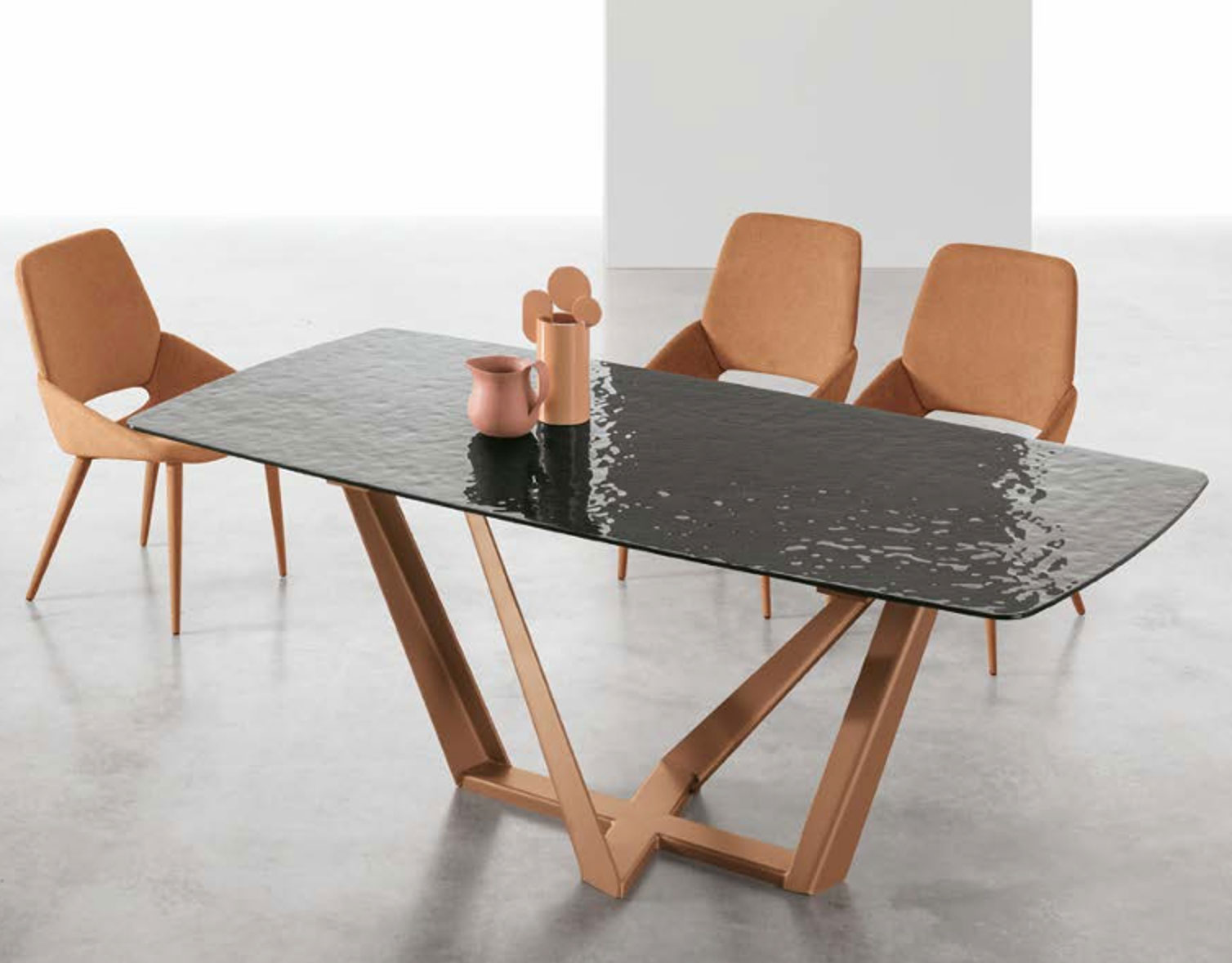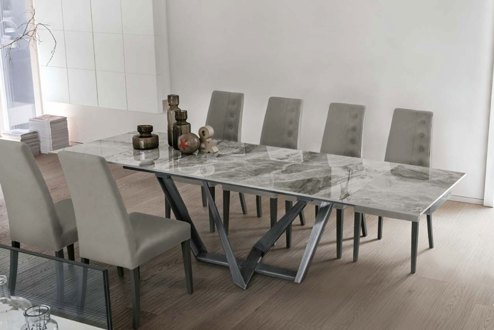 Tavolo allungabile con struttura in metallo verniciato. Piano ed allunghe in Gres porcellanato, vetro temperato con stampa digitale, vetro ondulato.
