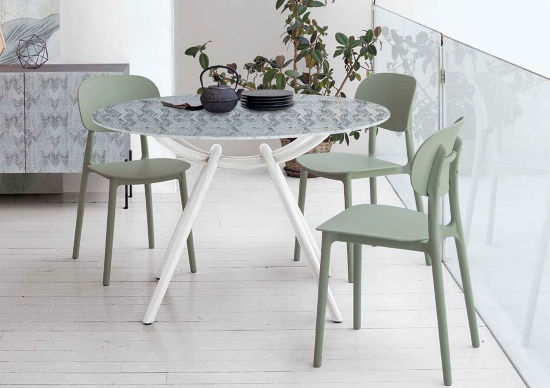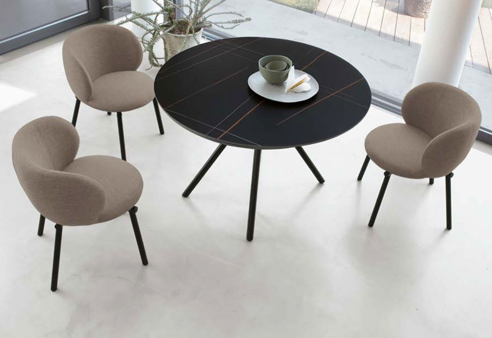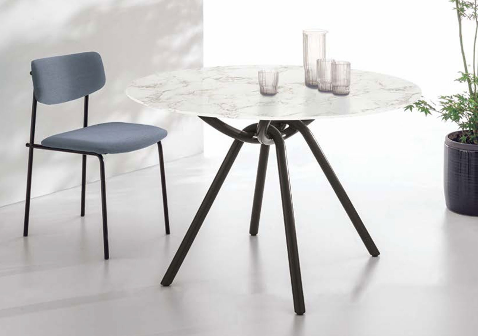 Tavolo rotondo fisso con basamento centrale in metallo verniciato. Paino in vetro temperato con stampa digitale o laminato.