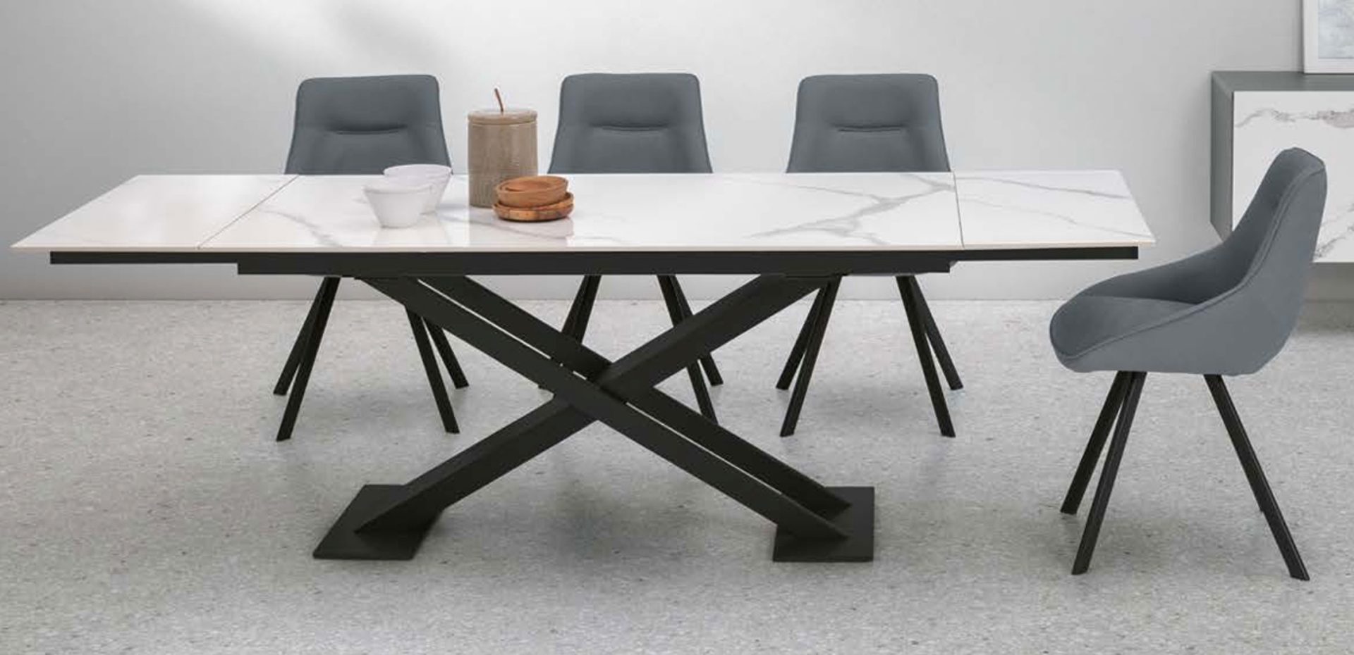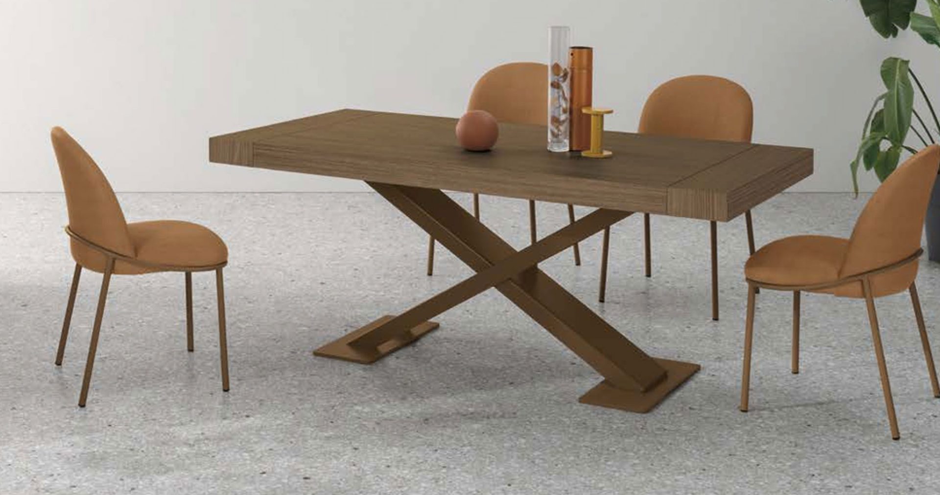 Tavolo allungabile con basamento centrale in metallo verniciato. Piano in gres porcellanato, laminato effetto legno.