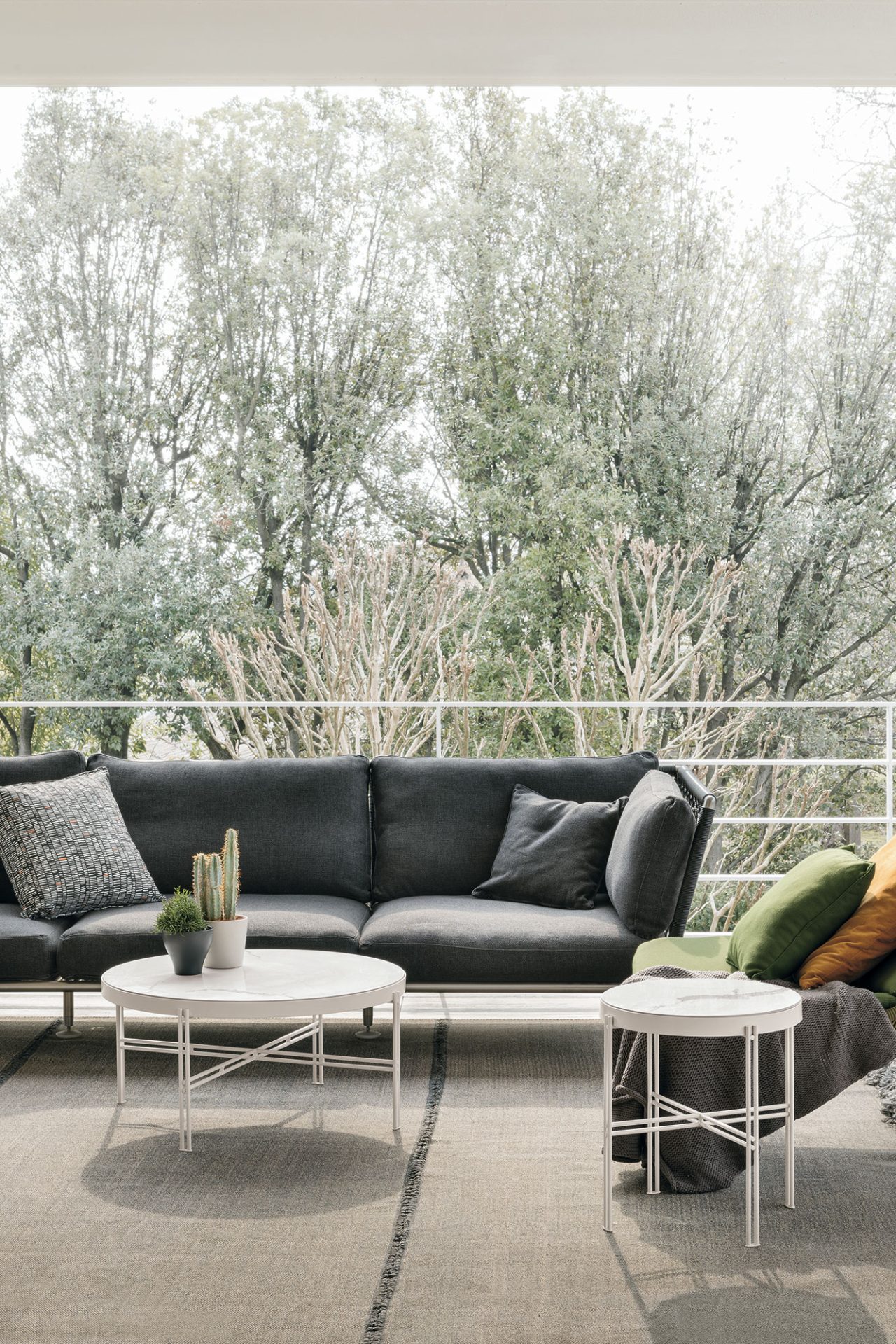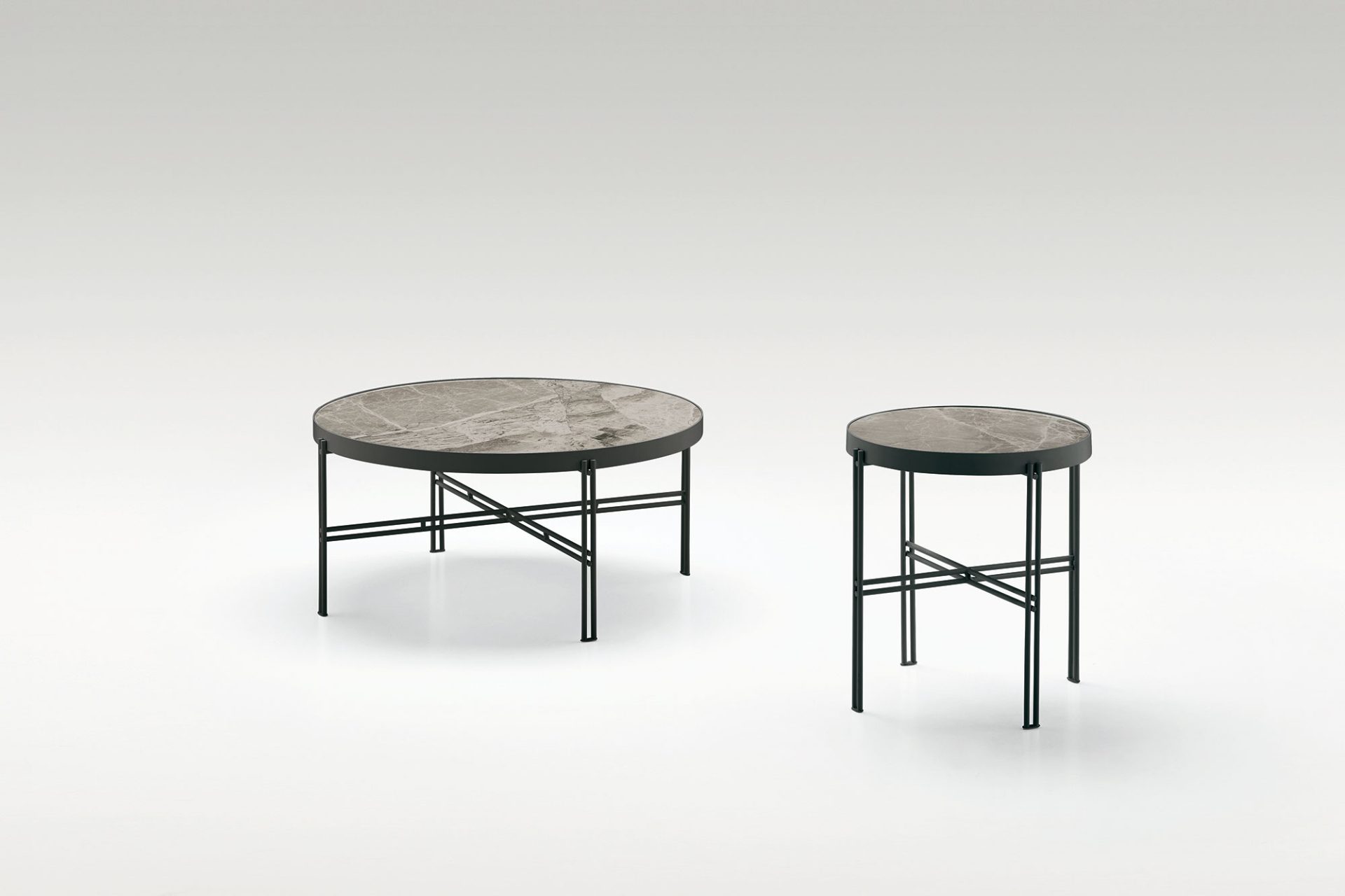 Tavolino da salotto con struttura in metallo verniciato e piano in gres porcellanato.