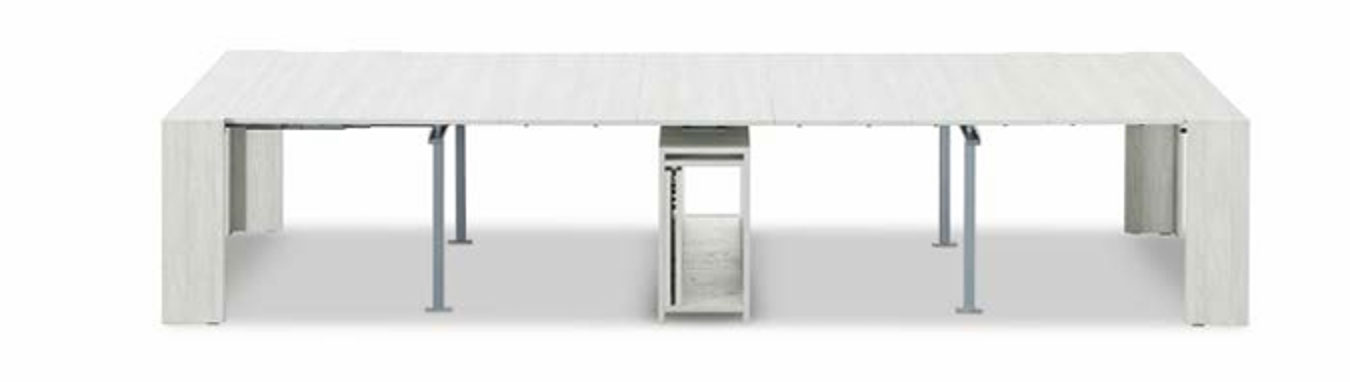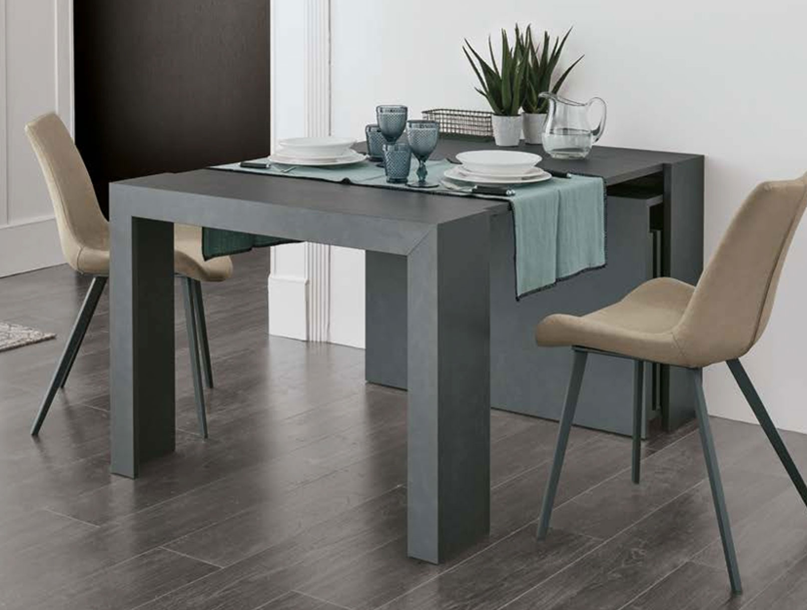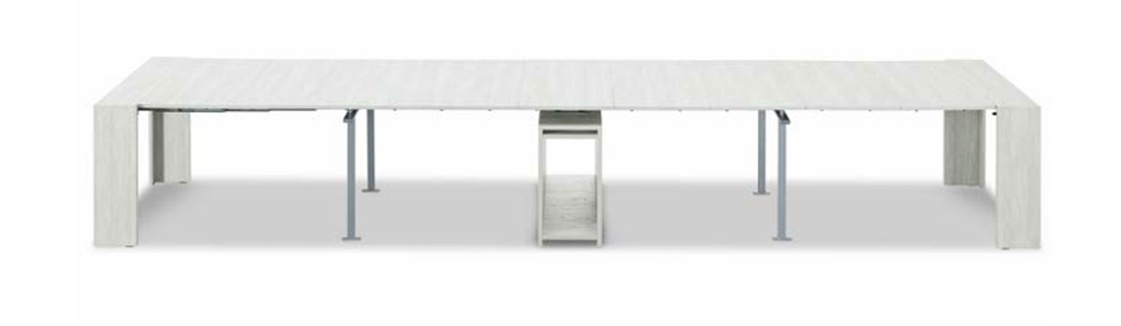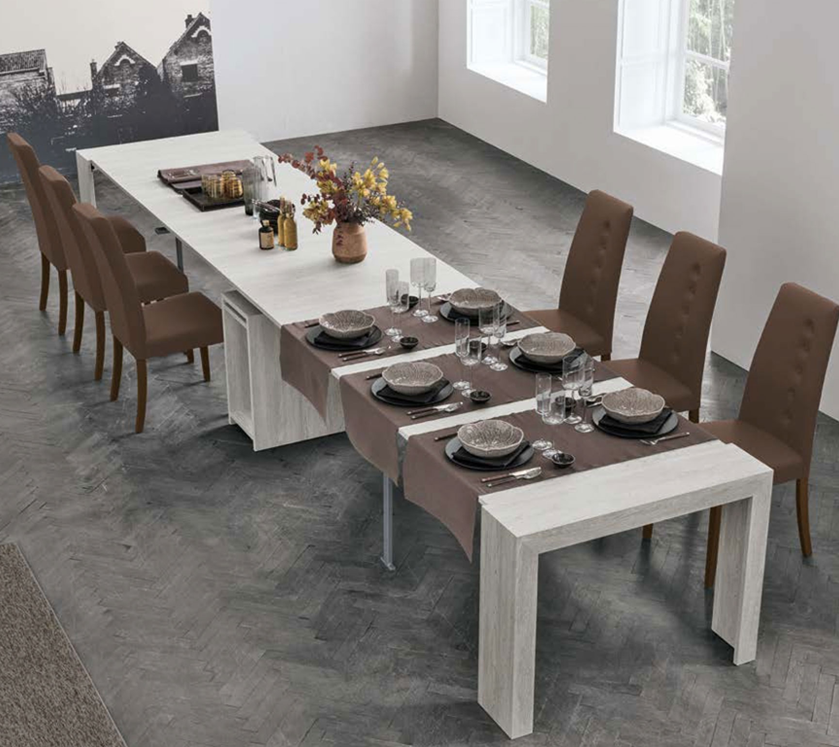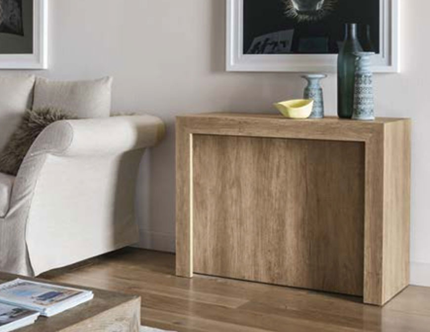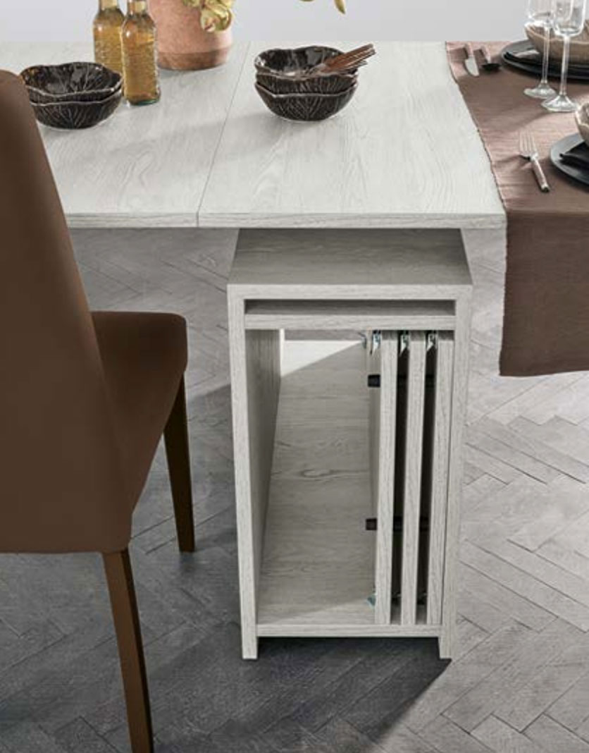 Consolle allungabile in laminato con vano per riporre le allunghe.