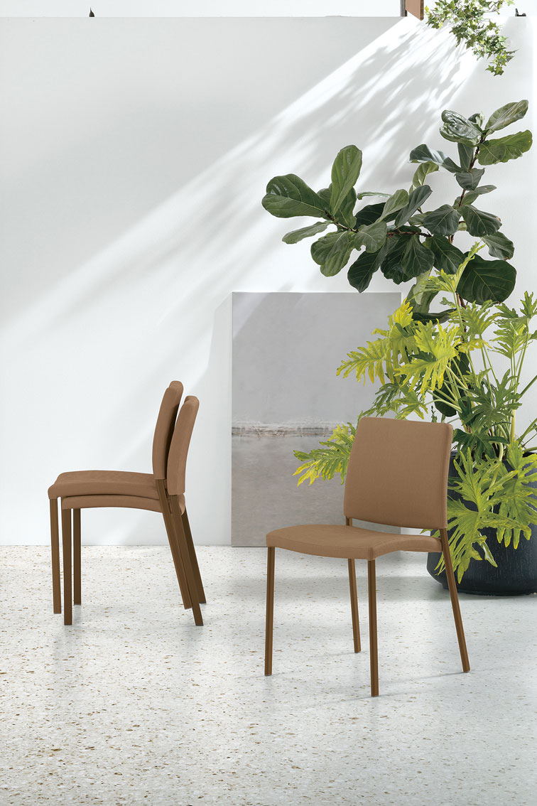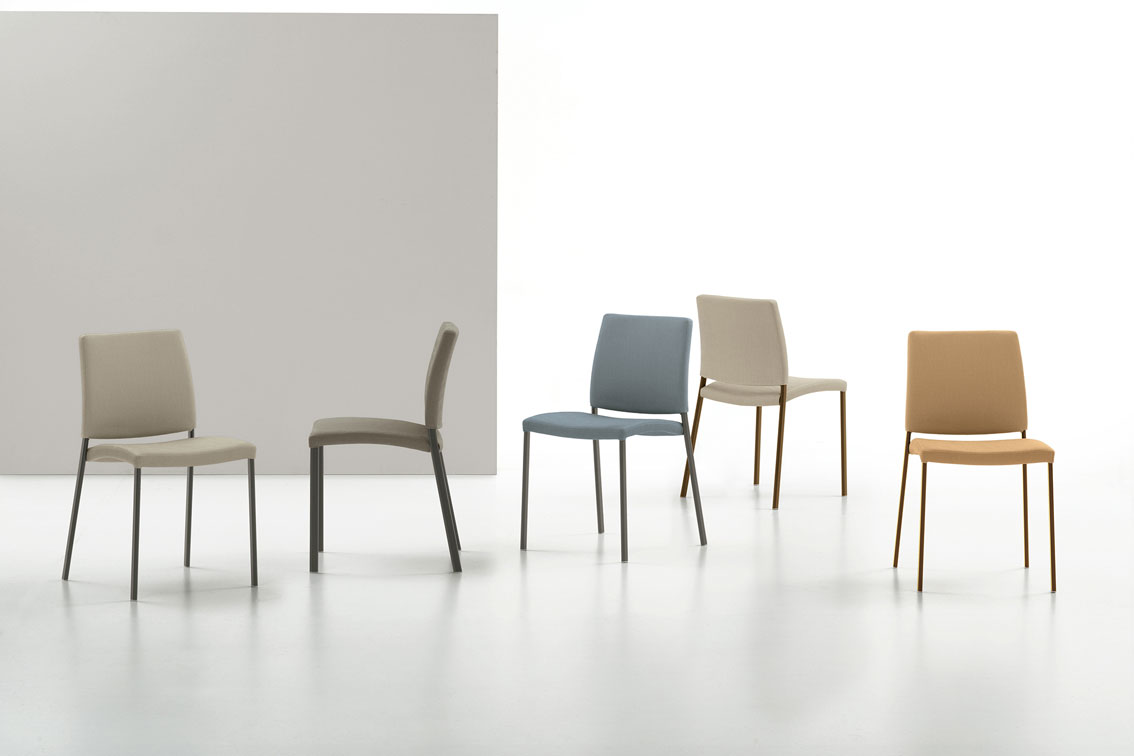 Sedia con struttura in metallo verniciato e seduta e schienale imbottiti in morbido tessuto Clean-Touch. Impilabile.